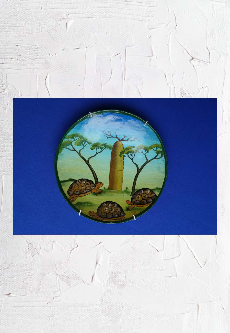 Schale (Durchmesser 20 cm), handbemalt mit den nur noch seltenen Sternschildkröten und einem Affenbrotbaum (Baobab). Der mittige Baum ist das Wahrzeichen der Insel Madagaskar, wird 800 Jahre alt und gehört zu den Naturwundern der Welt. Die Früchte sind Nahrungsmittel und dienen der Volksmedizin.
