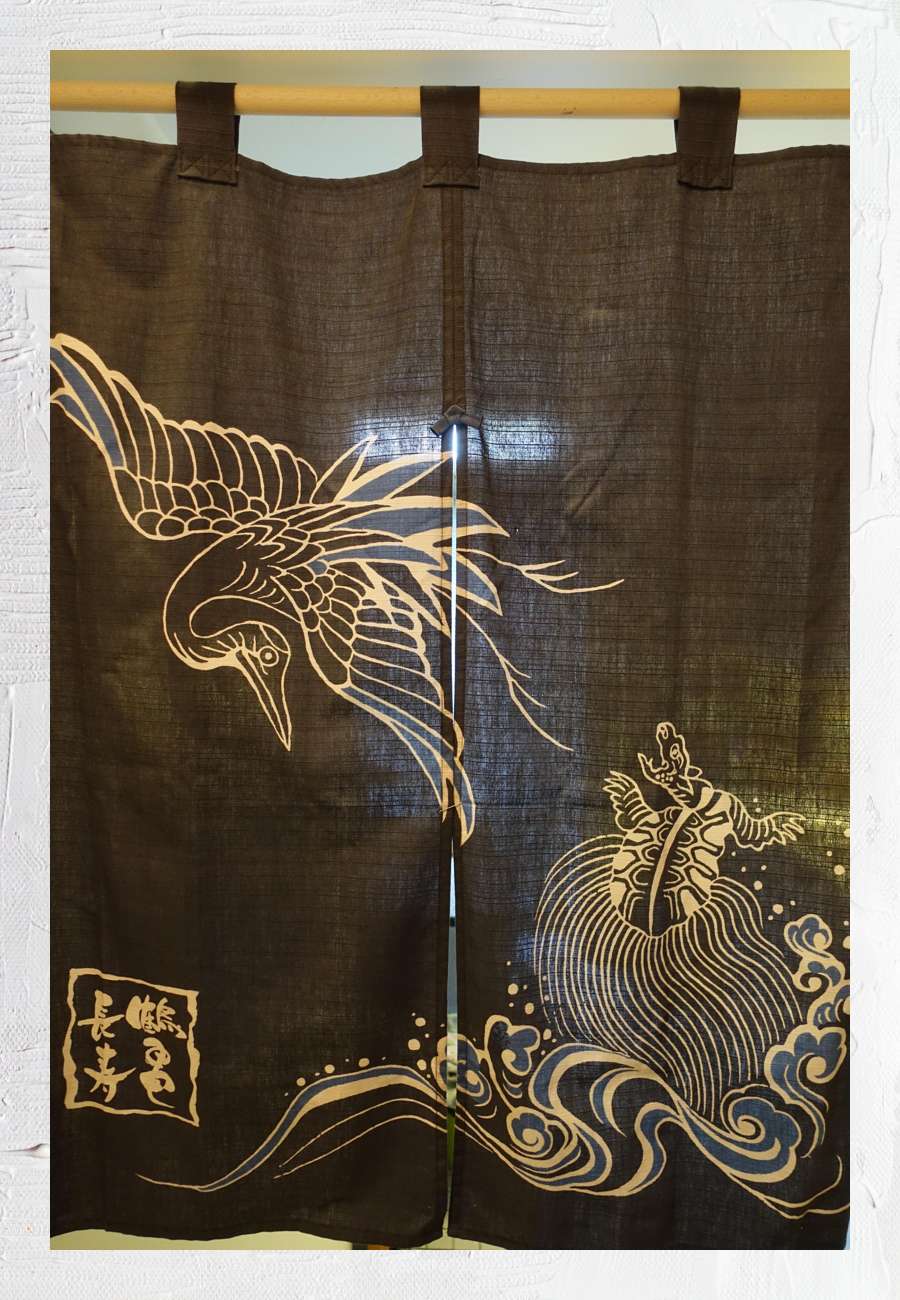 Zeitgenössischer Raumteiler (Türvorhang aus Japan), dort "Noren" bezeichnet, mit den klassischen Motiven Minogame, Kranich und einer Art Siegel. Mittig ein Schlitz für den leichteren Durchgang zwischen den Zimmern, oben Schlaufen zur Aufhängung an einem Holzstab, Größe ca. 95 x 82 cm.