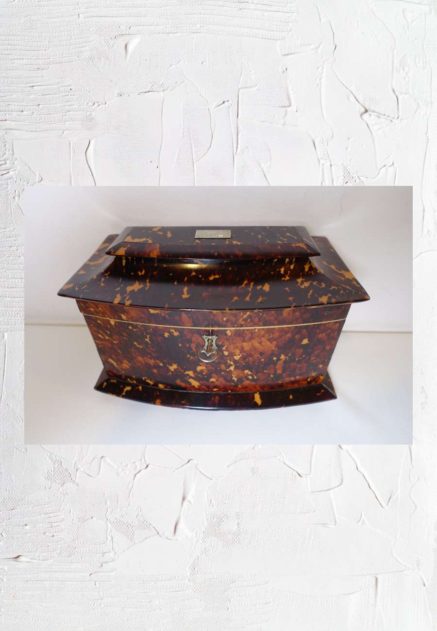 Kästchen aus Holz, Luxusgegenstand, von einem englischen Ebenisten gestaltet, rundum mit Schildpatt (aus Sizilien importiert) verkleidet, Originalschloß, oben ein mit Initialbuchstaben verziertes Silber-Plättchen, um 1850, Basis 24 x 14 cm, Höhe 16 cm.