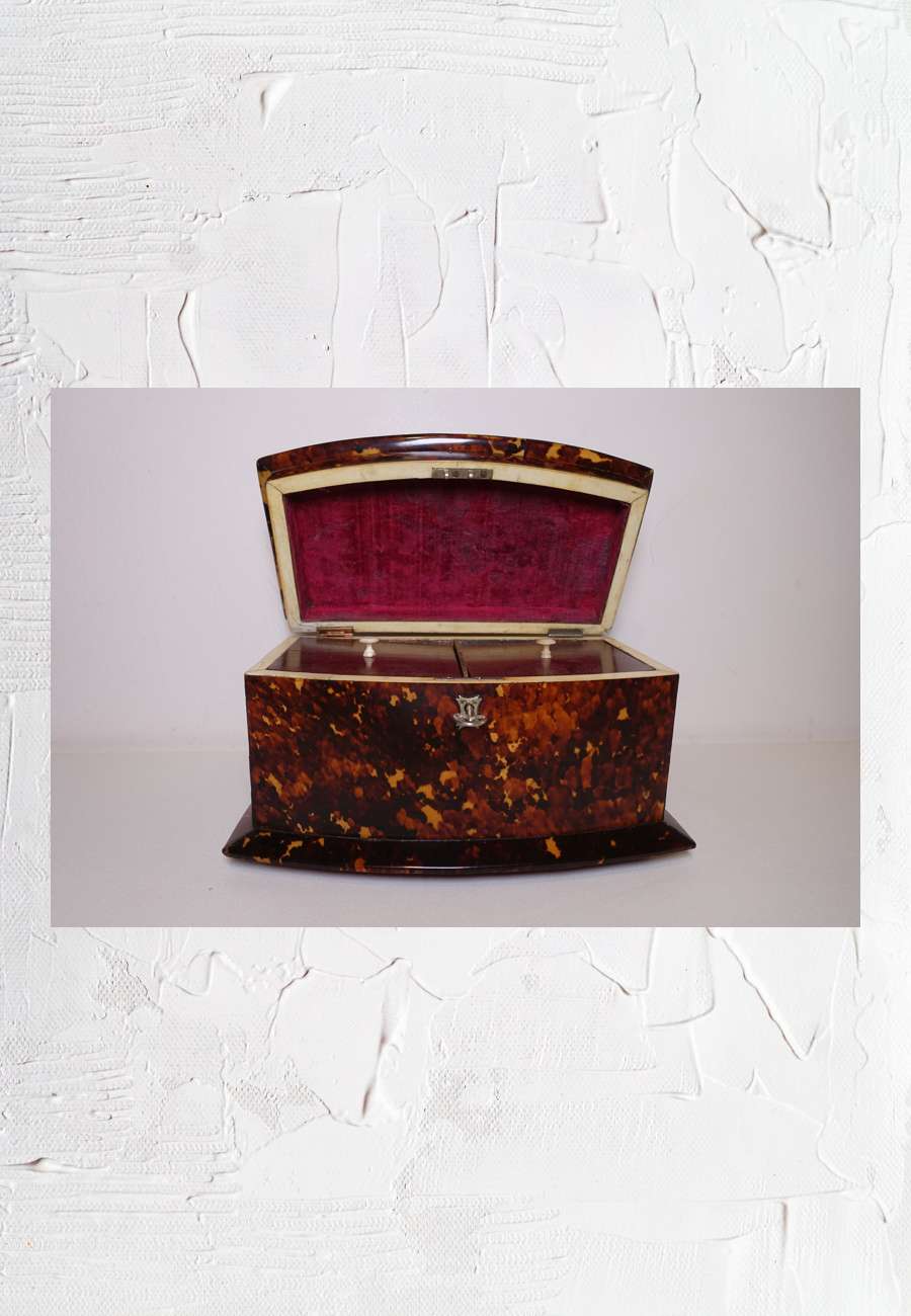 Blick in das beschriebene Schildpatt-Kästchen, mit zwei Fächern, innen mit einer teilweise erhaltenen Zinnfolie ausgeschlagen (zur besseren Aufbewahrung