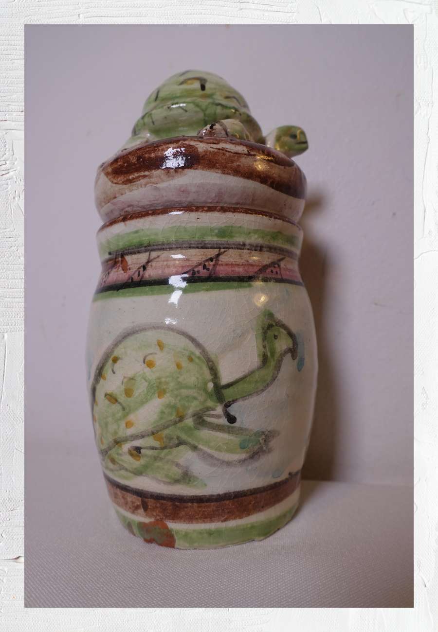 Dose, handgetöpfert und bemalt, mit der für den Künstler typischen "Handschrift", sign., Höhe ca. 20 cm.