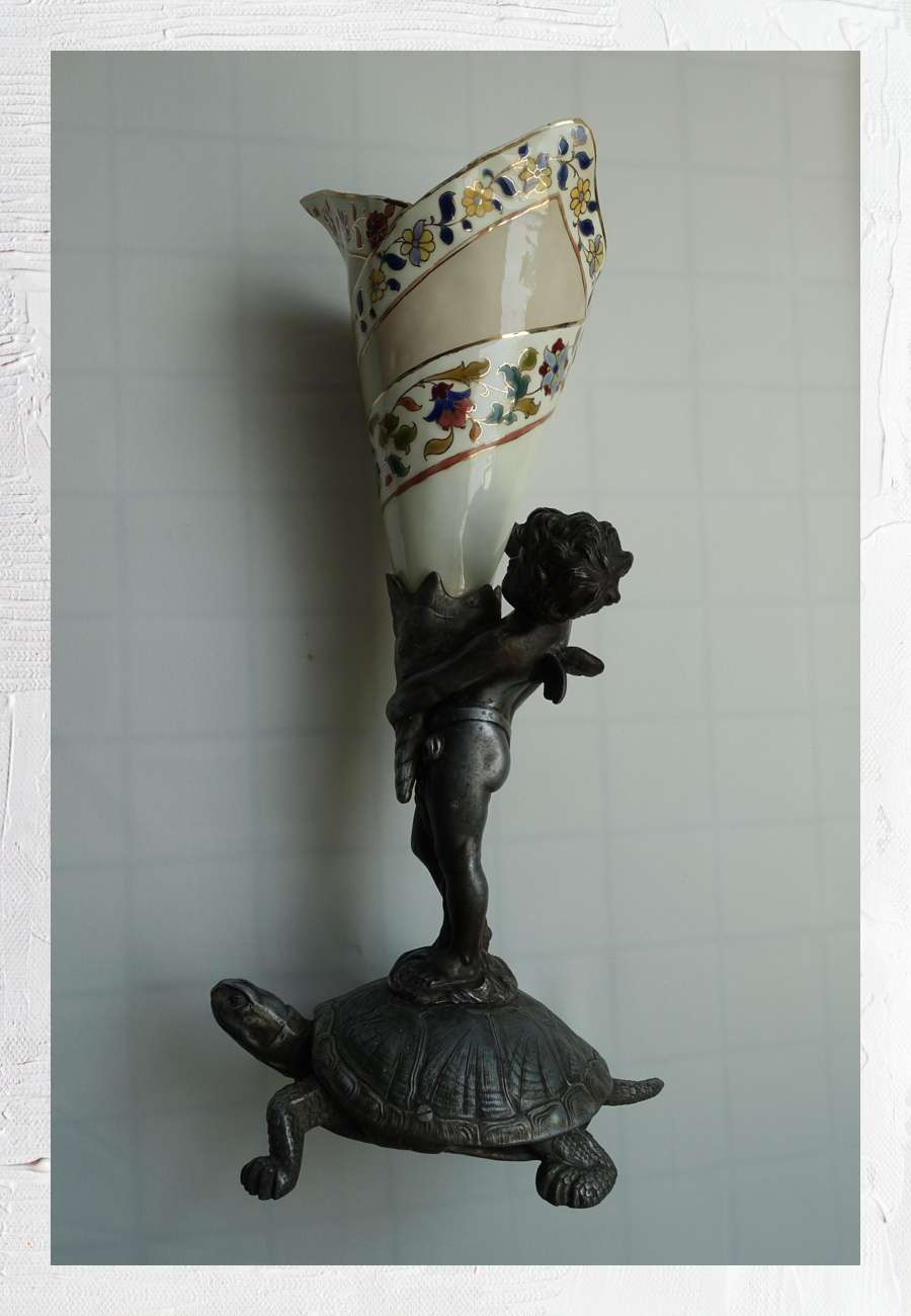 Guss aus einer Legierung von Zinn, Zink und Blei, um 1900, Höhe 44 cm. Ein fast nackter Putto mit kleinen Flügeln hält ein Füllhorn, in dem eine große, mit Blüten bemalte Vase (Porzellan) steckt. Das Objekt ist eher ein Schau- als ein Gebrauchsgegenstand, aber als Vase nutzbar.