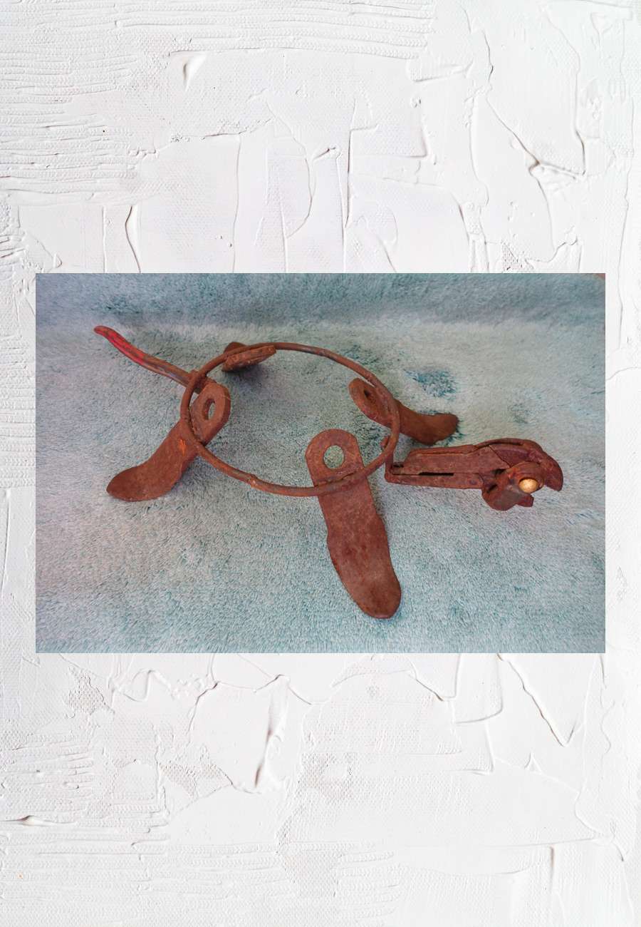 Unterbau zu einem DDR-Stahlhelm, vom vielseitigen Künstler aus diversen, alten Fundstücken gekonnt zusammengeschweißt und mit goldfarbenen Augen versehen, Größe 60 cm.