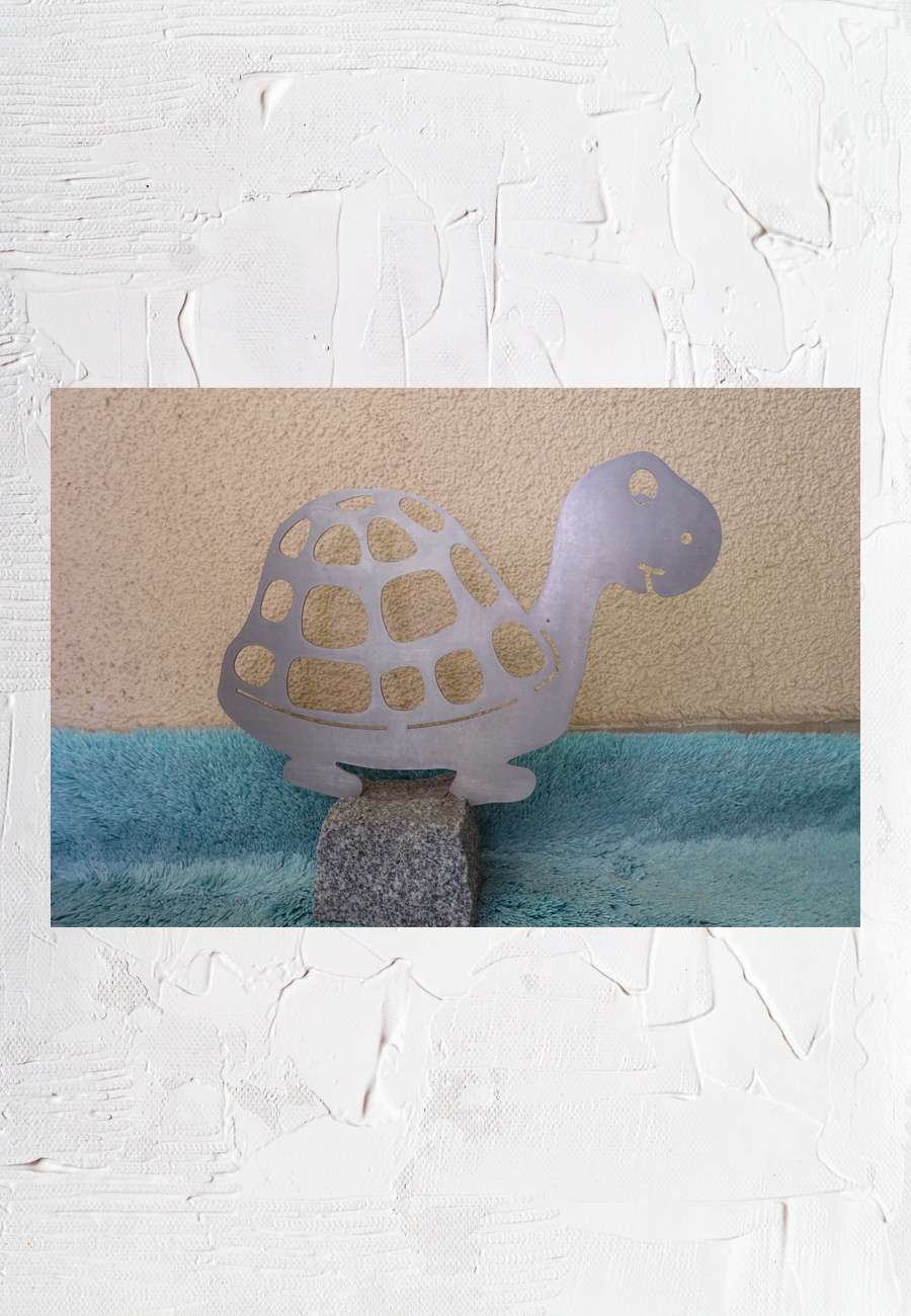 Stahlplatte, Laserschnitt, Breite 36 cm, Höhe (mit Granitsockel) 31 cm.