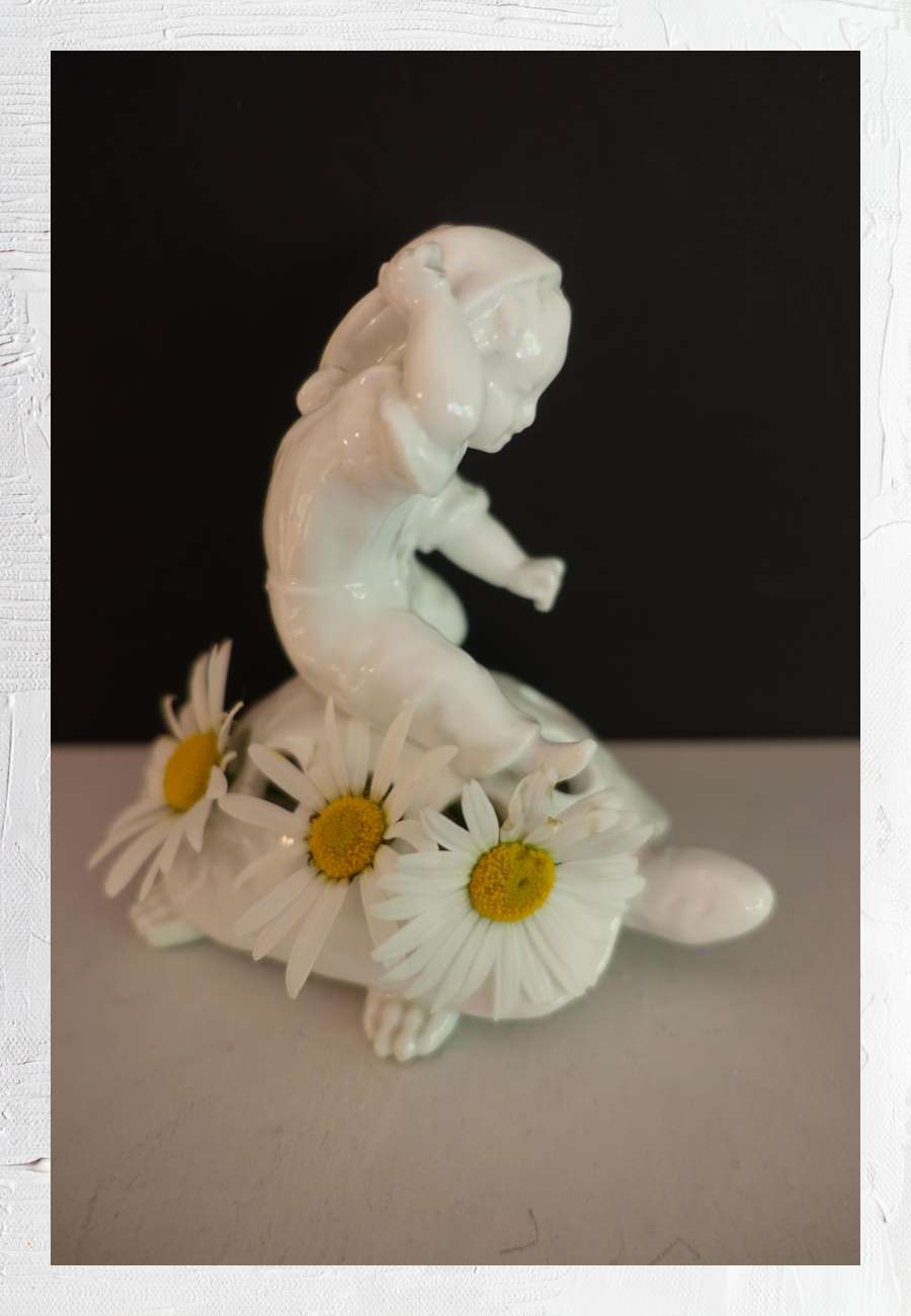 Tischdekoration, kleine Vase mit 10 Löchern für einzelne Blüten. Ein Knabe mit Zipfelmütze treibt die Schildkröte mit einem Stöckchen an, ca. 1930-er Jahre,