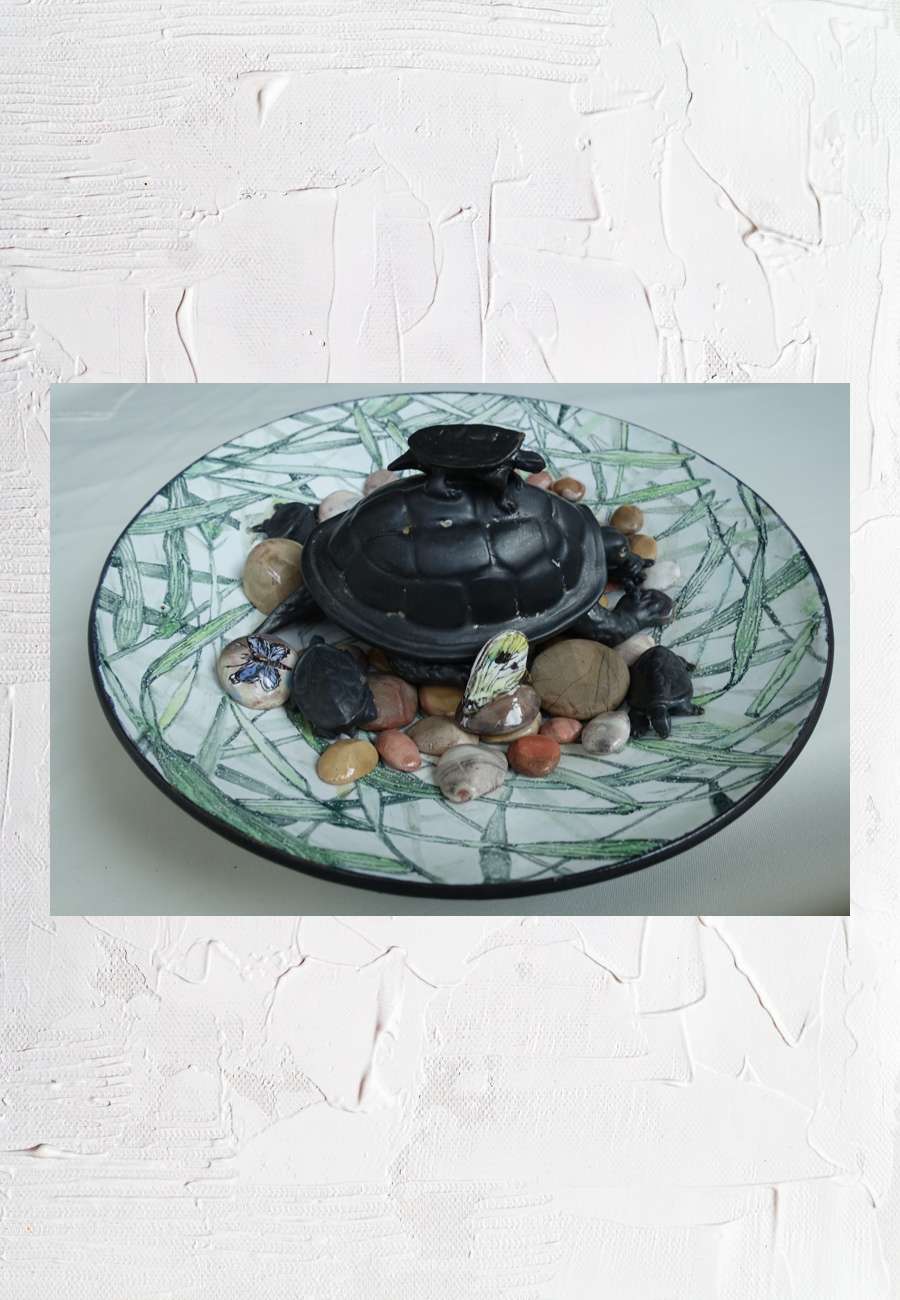 Auftragsarbeit, Unikat, Töpferschale, schwarzgrundig, bemalt (Fayence, Engobe- und Glasurmalerei) und dann in meinem Sinn skulptural weitergestaltet, mit einer großen Schildkröte