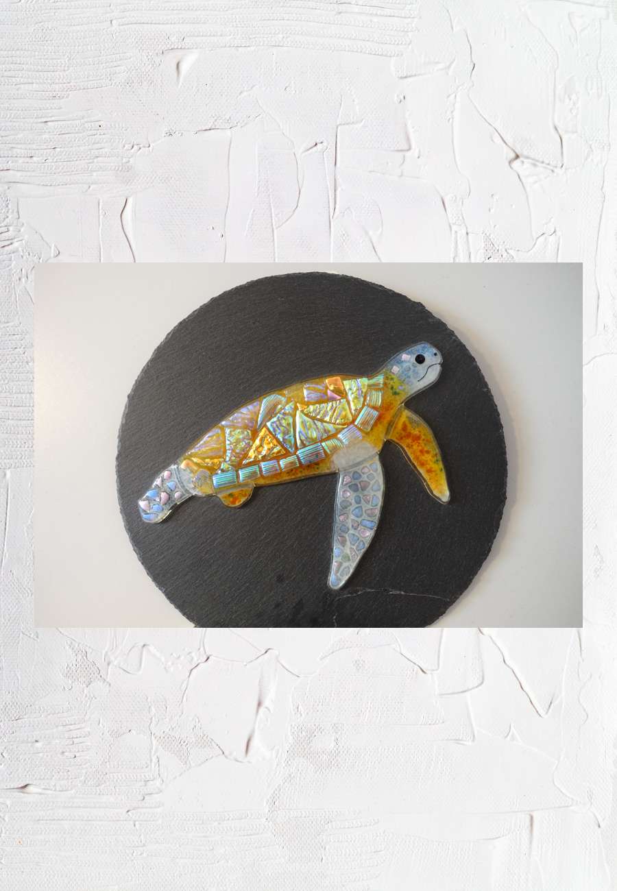Glas-Fusing mit Dichroic-Glas, Unikat aus Passau, handgearbeitet, mit mehreren Brennvorgängen, skulptural auf einer Schieferplatte präsentiert, Durchmesser 30 cm. Das Glas ist eine Entwicklung aus der Raumfahrt-Industrie, bei dem dünne Schichten von Metalloxyden