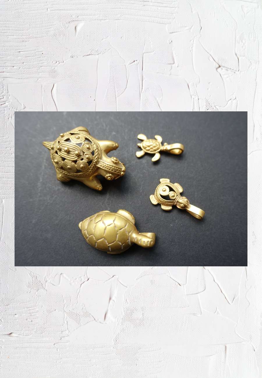 Vier Schmuck-Anhänger, davon 2 Ohrringe (je 2,8 cm), der linke Anhänger ist alternativ auch als Brosche (5 cm) zu tragen, 24 K gold plated, Repliken von altem Goldschmuck aus der präkolumbischen Zeit (ca. 500 - 1.500 n. Chr.). Die Originale befinden sich im Museo del Oro, Bogota (Kolumbien). Ein großer und einzigartiger Ausstellungsteil, dort sind die vielen Fundstücke aus purem Gold.