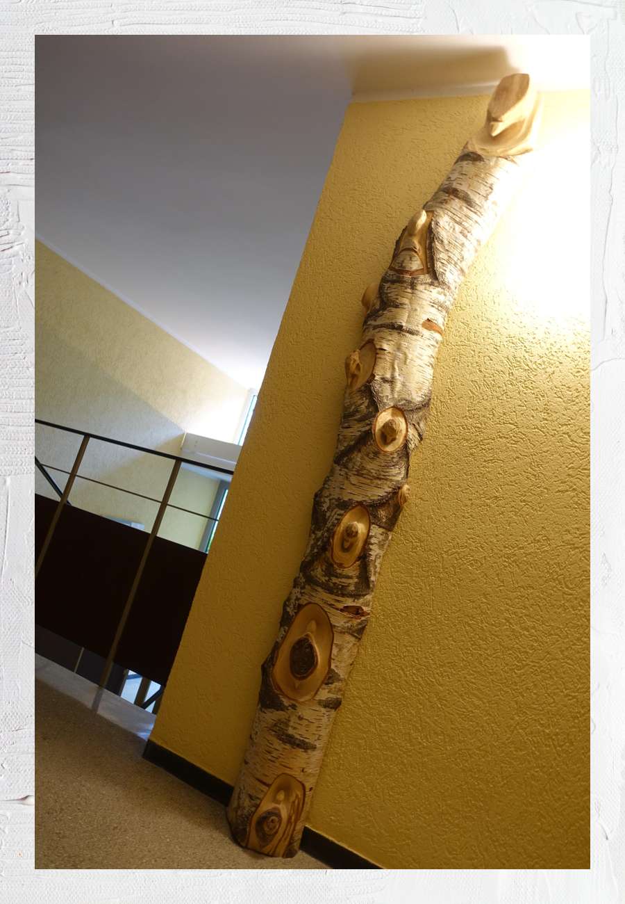Hermann Bigelmayr. Nach der vorjährigen Erfahrung entschied ich mich schnell für einen stattlichen Birkenstamm (Durchmesser ca. 30 cm), den ich in Hinblick auf eine raumsparende Aufstellung halbieren und auf die Höhe von 2,4 m zuschneiden ließ. Die natürlichen Astauswüchse nutzte ich für das