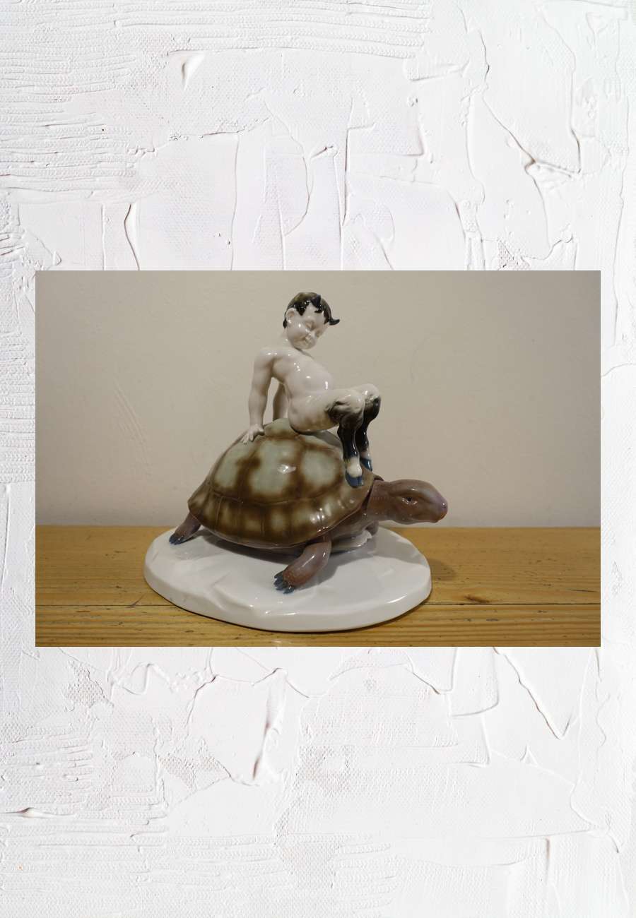 Porzellanfigur, ein Faun mit Hörnchen und Bocksfüßen sitzt auf einer großen Schildkröte, um 1910, grüne Herstellermarke im Boden: