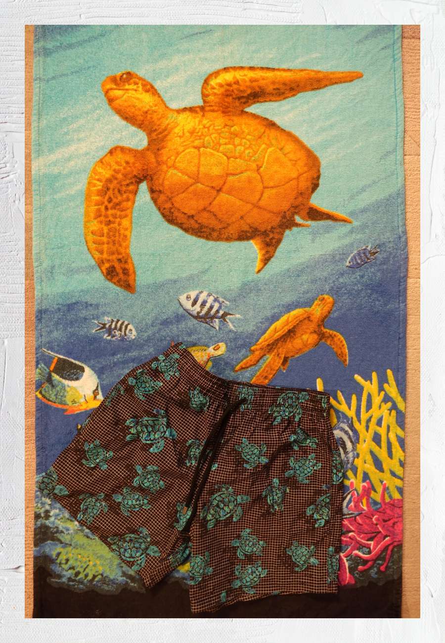 Badehandtuch (Fa. Maisonette), 100 % Baumwolle, Made in Turkey. Badehose (Fa. Vilebrequin, s. auch Luftmatraze und T-shirts), 50 % Baumwolle und 50 % Polyester,
