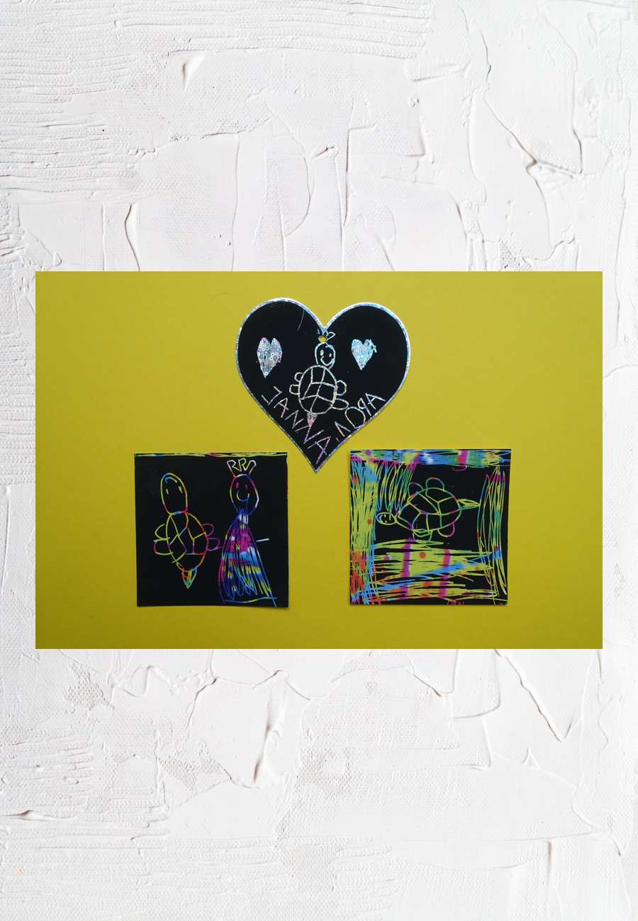 Drei kleine Bilder, beschichtetes Papier, die Motive werden eingeritzt, Alter 5 Jahre.