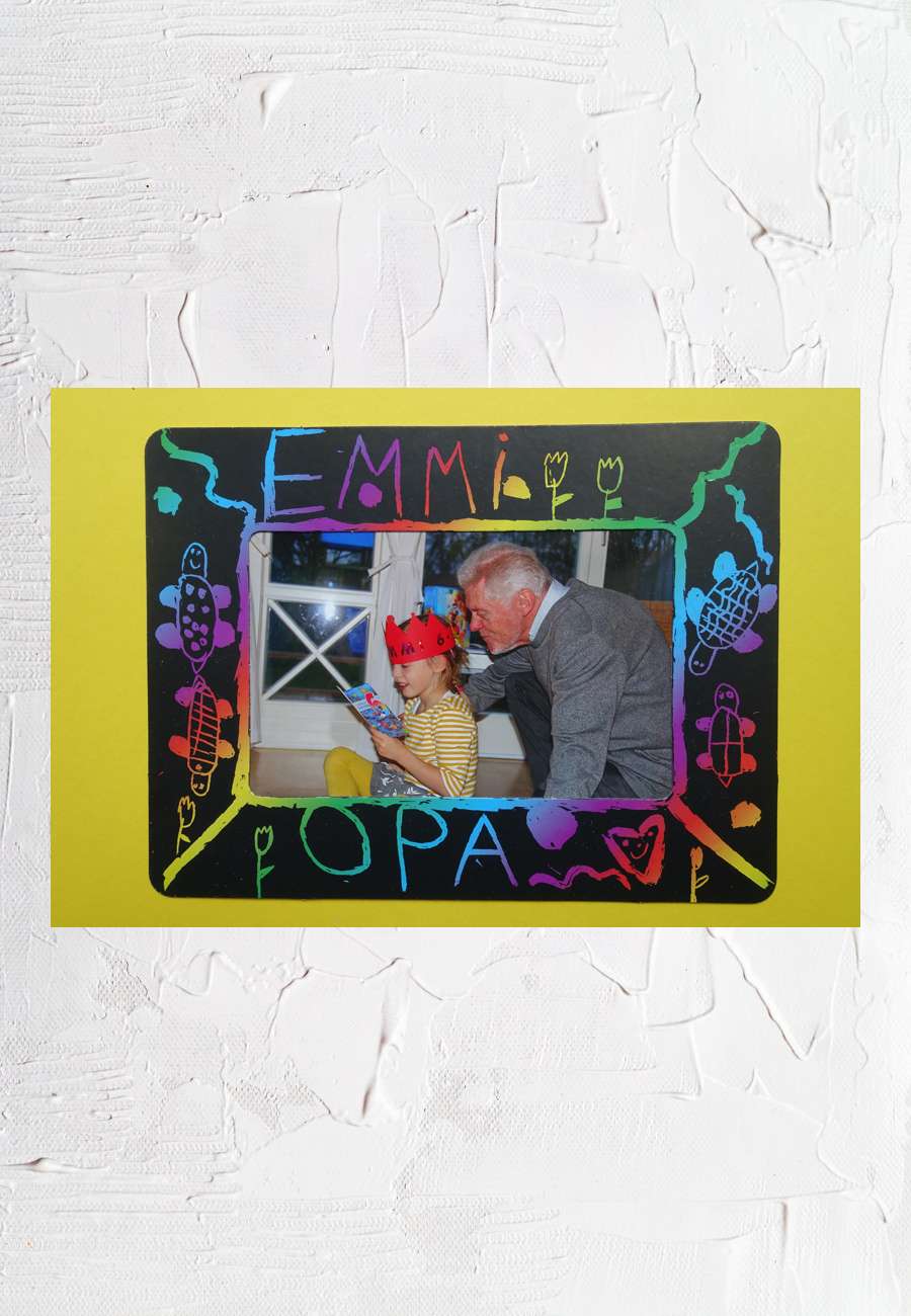 Bilderrahmen, beschichtetes Papier, Motive eingeritzt, Alter 6 Jahre, Format ca. DIN A 5.