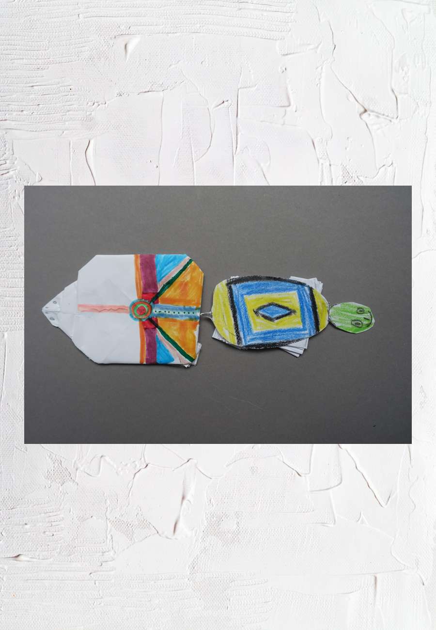 Papierfaltungen (origamiartig), bemalt, je ca. 12 cm, links Lukas (9 Jahre), rechts Jakob (8 Jahre).