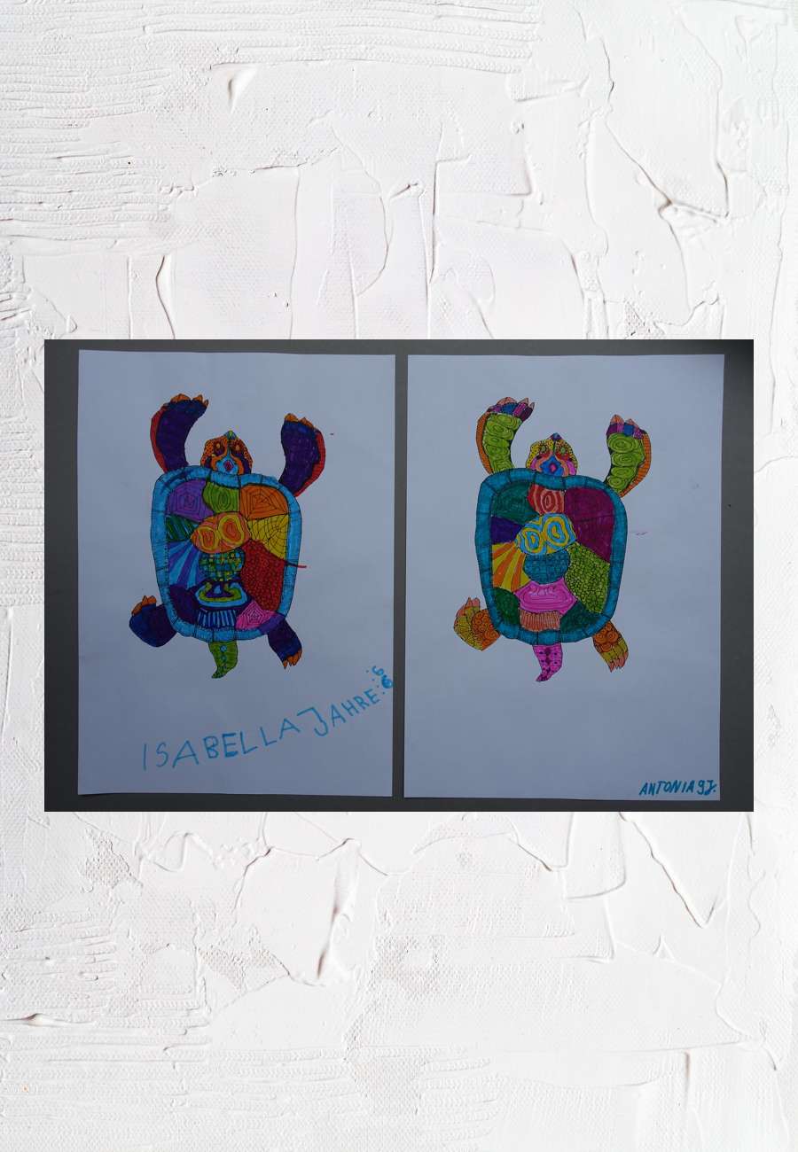 Ausgemalte Vorlage, Format je DIN A 4, Alter 6 bzw. 9 Jahre.