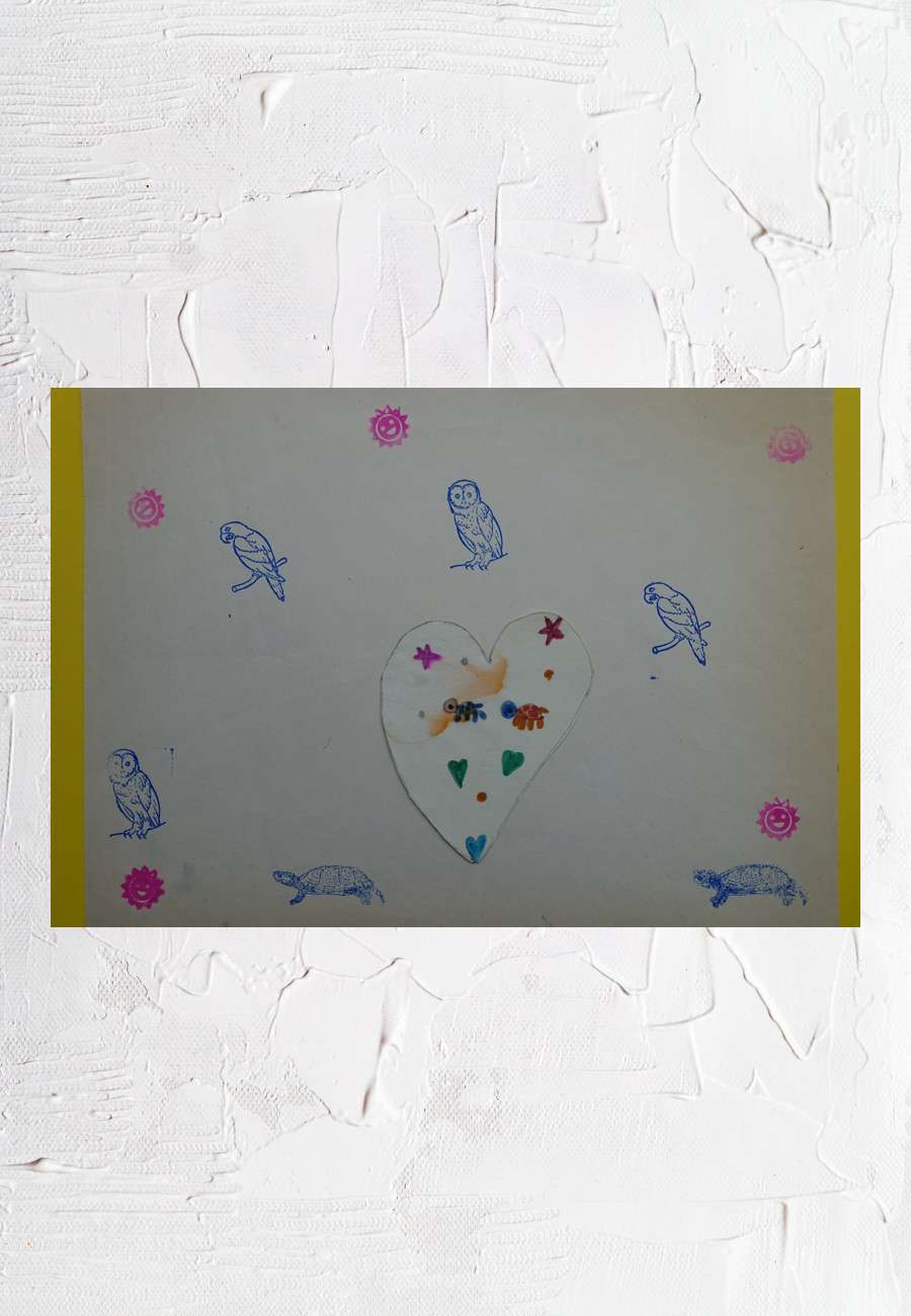 Collage, Buntstifte und Stempel, Format DIN A 4, Alter 6 Jahre.