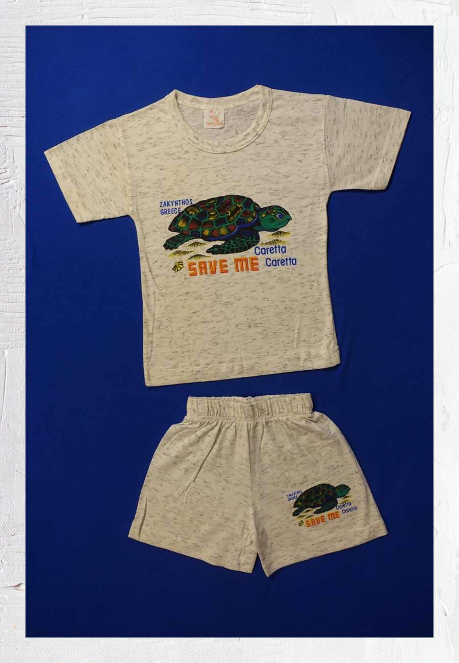 Kinder-Kleidung, 100 % Baumwolle, Made in Greece. Motiv ist die Rettung der gefährdeten Caretta Caretta (Trivialname: Unechte Karettschildkröten), die zur Eiablage auch an die Niststrände auf Zakynthos (Griechenland) kommen. Seit Jahren werden dort Erhaltungsprogramme durchgeführt, die sich mit dem Tourismus nur bedingt vertragen.