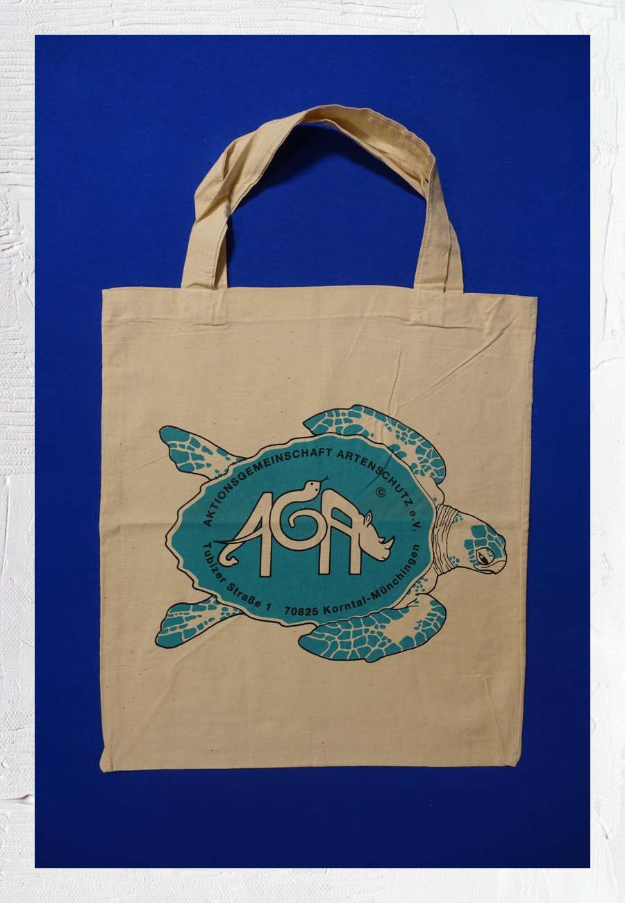Diese Tragetasche der Aktionsgemeinschaft Artenschutz (AGA), aus Baumwolle, ist ein Beispiel für deren Werbeartikel zugunsten von Schildkrötenprojekten.