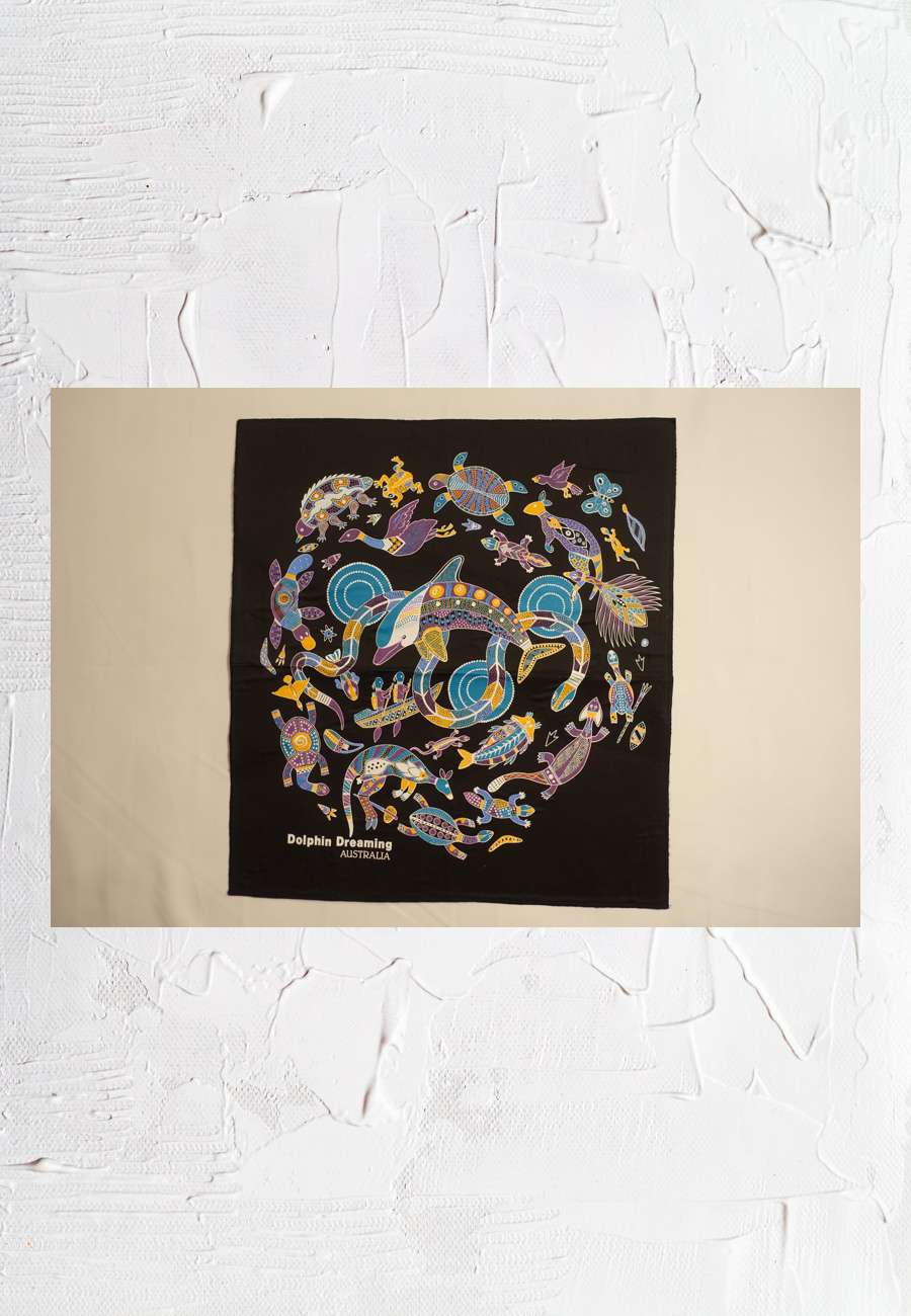 Aboriginal Art, mit typischen Tieren Australiens, auf Stoff gedruckt, darunter vier Meeresschildkröten, Format 48 x 53 cm.