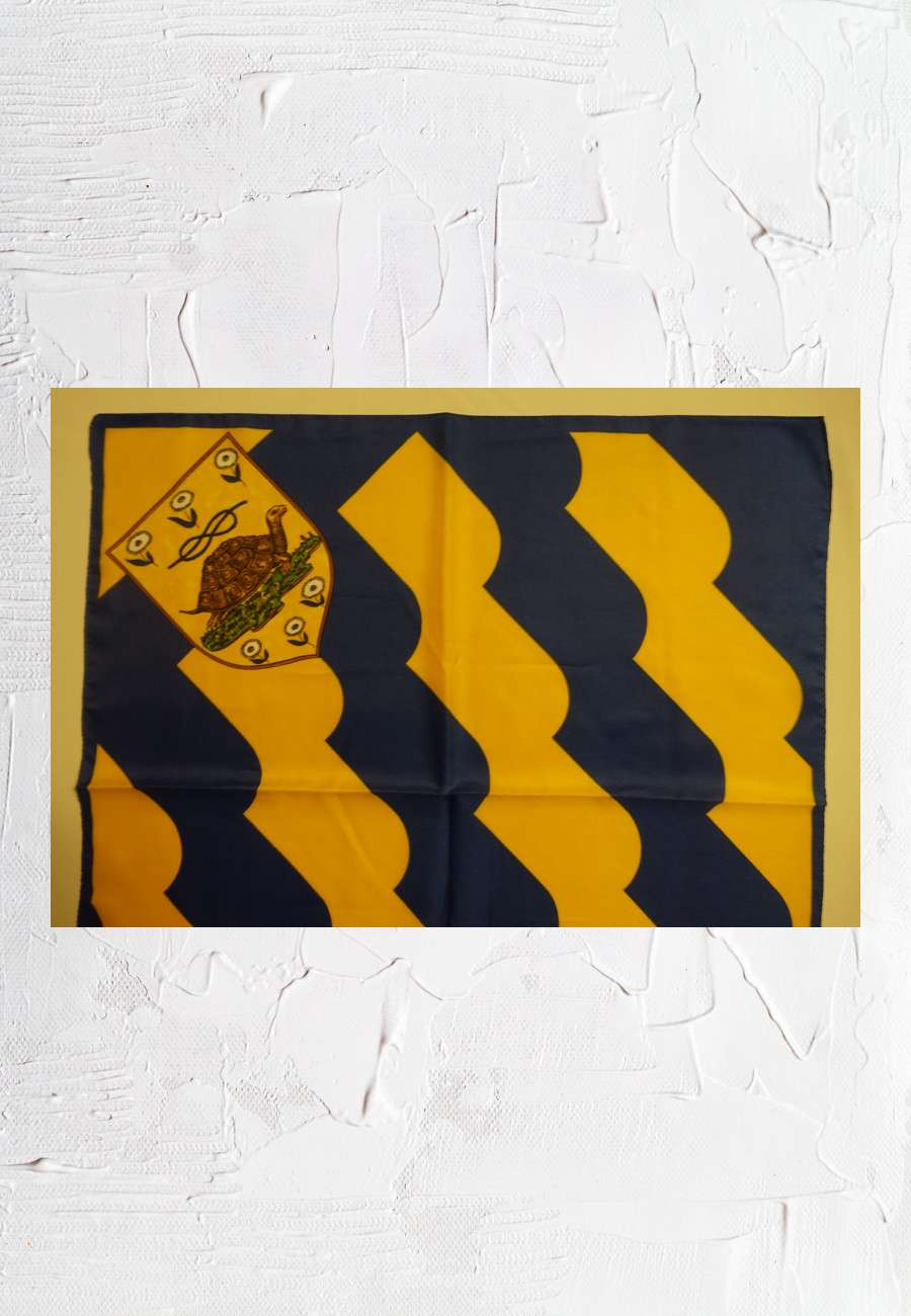 Dieses Souvenir ist ein Halstuch, das Motiv bezieht sich auf den Palio di Siena, die Schildkröte (mit Knoten und Margheriten) im Wappen ist das Zeichen der Contrada della Tartuca, Made in Italy, Format ca. 50 x 50 cm.