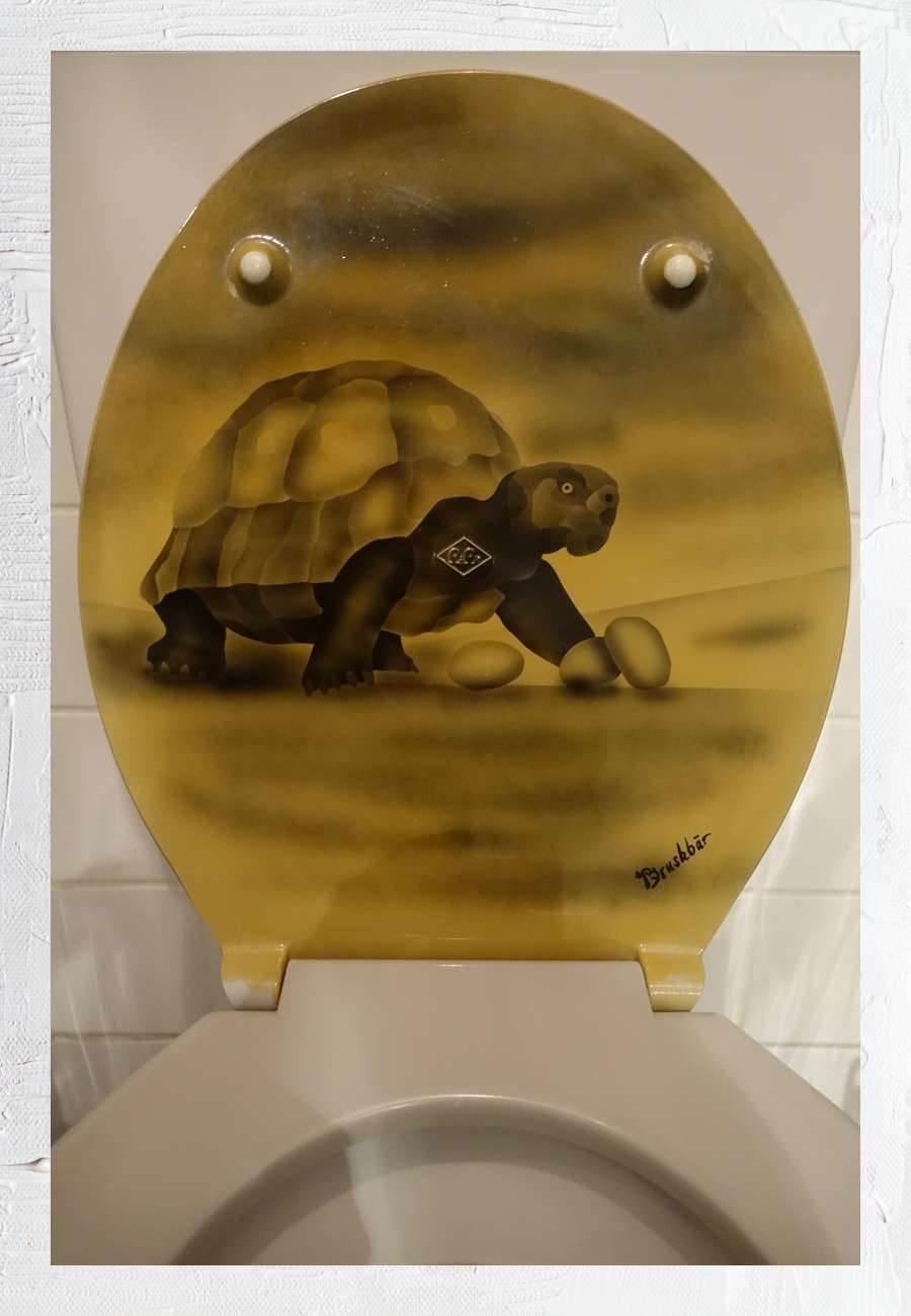 Auftragsarbeit, WC-Deckel, Unikat, bemalt in Airbrush-Technik (mit einer Airbrush-Pistole und Farben auf Acryl-Wasser-Basis), sign. "Brushbär".