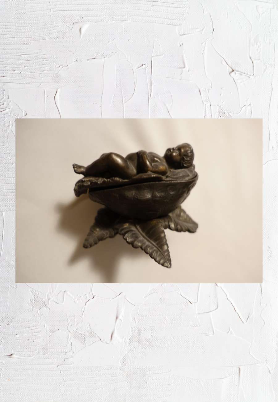 Bronze-Guss, 10,5 cm. Ein vergleichbares Stück ist im Musee des beaux-arts de Pau zu sehen. Es läßt sich aufklappen und ist dann als Dose nutzbar. Das Motiv geht zurück auf den späteren franz. König Henri IV., der in Pau (im südwestlichen Pyrenaenvorland Frankreichs) geboren wurde. Dessen Wiege bestand aus dem Panzer einer großen Meeresschildkröte und befindet sich noch heute im Schloß der Stadt.