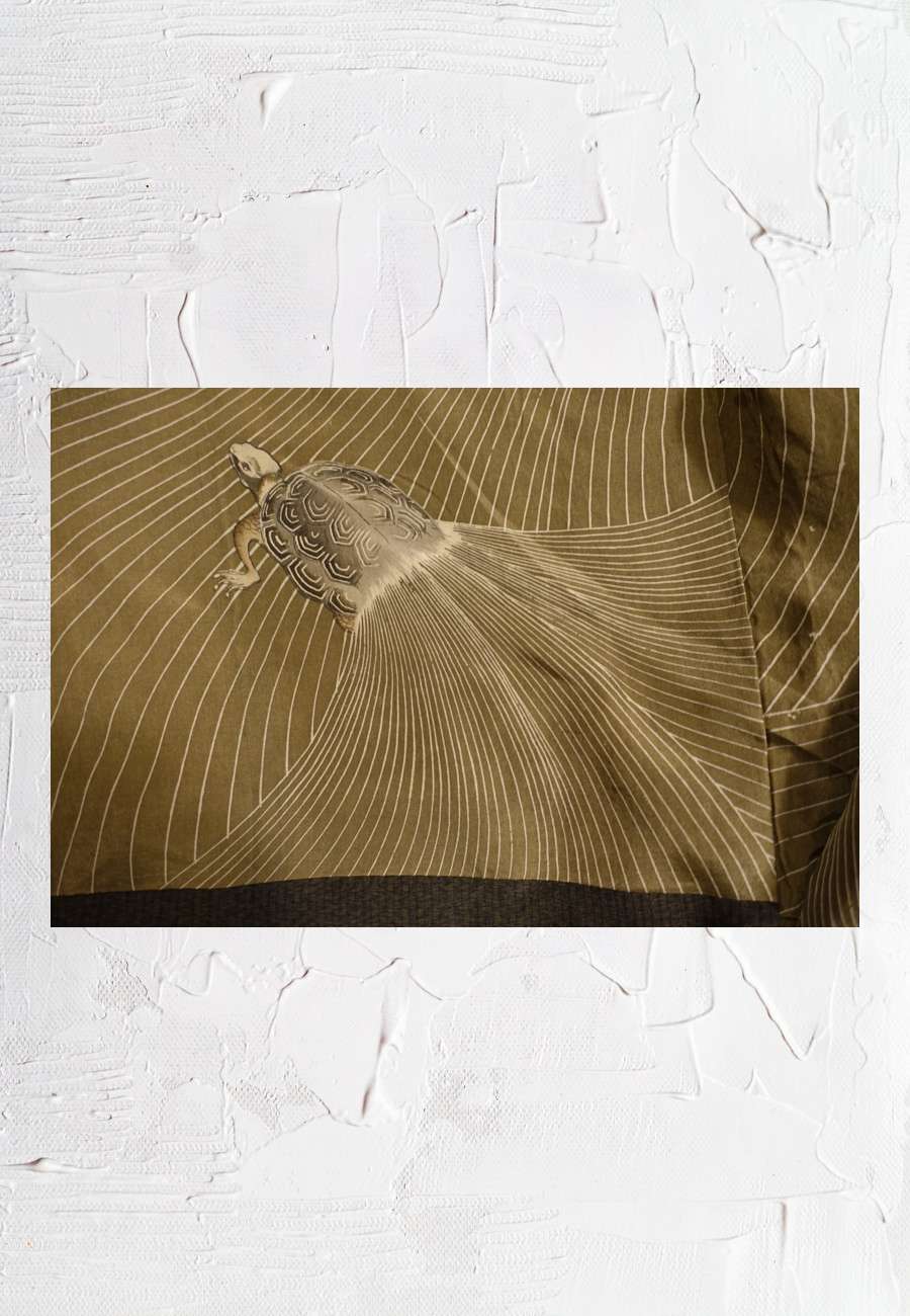 Schlichter Hausmantel aus Japan, mit noblem Understatement. Das Innenfutter aus Seide ist mehrfach mit dem Glückssymbol Minogame