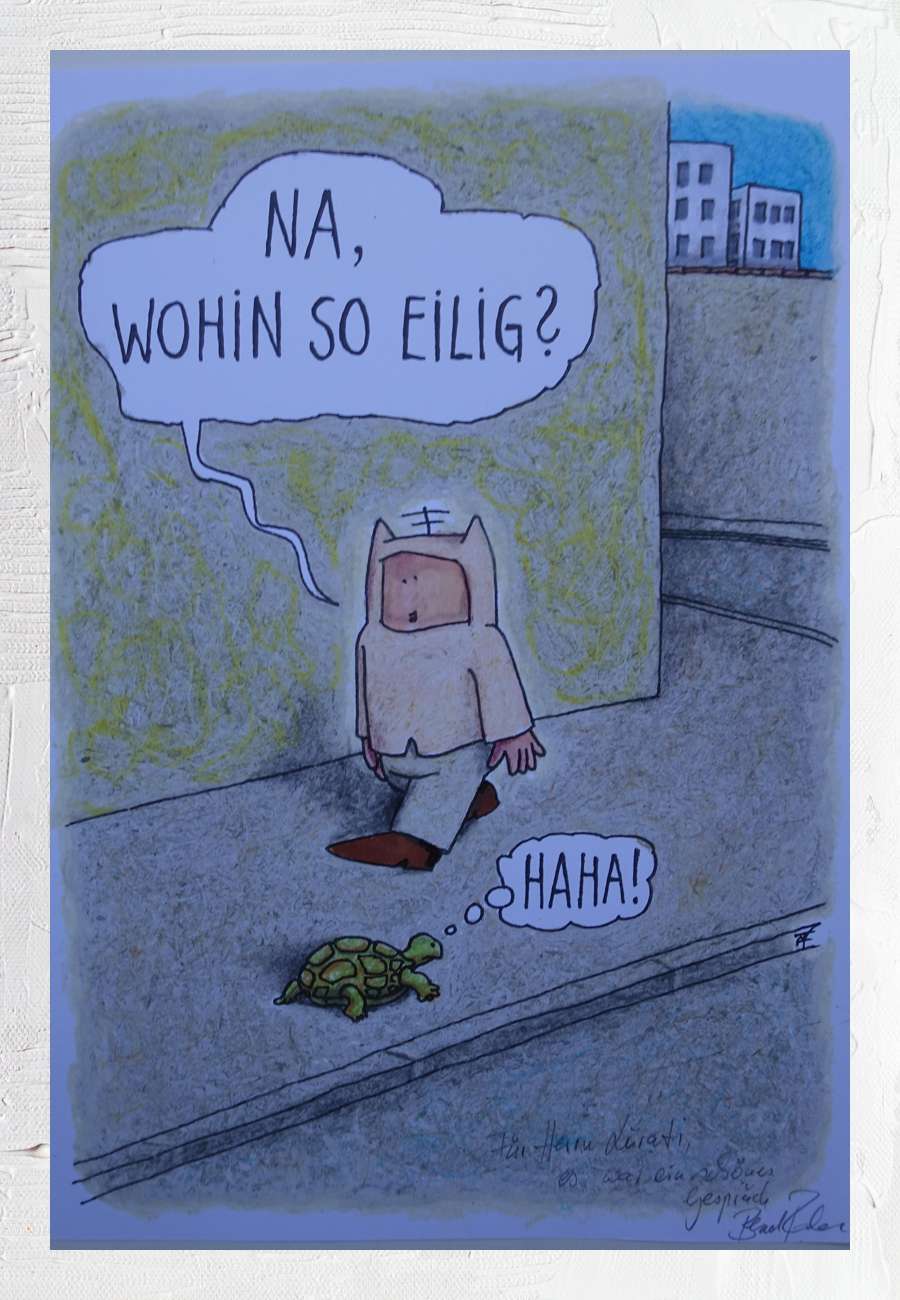 Cartoon, Original, Zeichnung, handcoloriert, Format DIN A 4, bei einem Besuch signiert ("es war ein gutes Gespräch"). Der Künstler arbeitet auch als Bühnenmaler und für die Requisite des renommierten Volkstheater München. Übrigens hängt sein großformatiges Bild