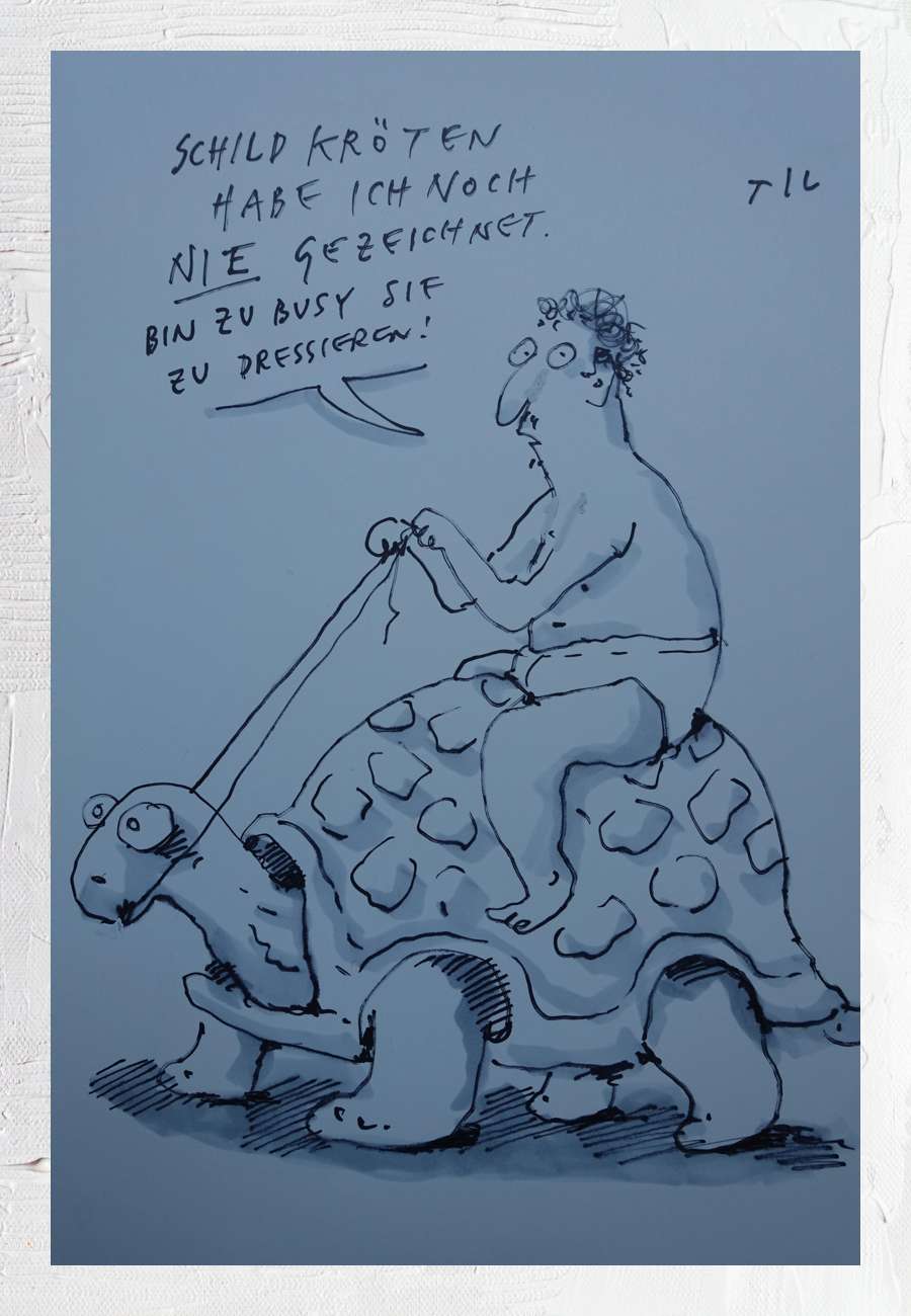 Zeichnung, Unikat, sign., Format DIN A 4. Diesen exklusiven Cartoon hat mein Neffe, der mit Til Mette befreundet ist, für mich erwirkt (der Reiter ist zugleich ein Selbstportrait von Til). Der Cartoonist und Maler (Kunststudium in Bremen) widmet sich aktuellen Themen aus Gesellschaft und Politik, mit zahllosen Veröffentlichungen in SZ, Frankfurter Rundschau, Punch, Funny Times, taz , Stern und eigenen Büchern. Er wurde mit mehreren namhaften Preisen ausgezeichnet.