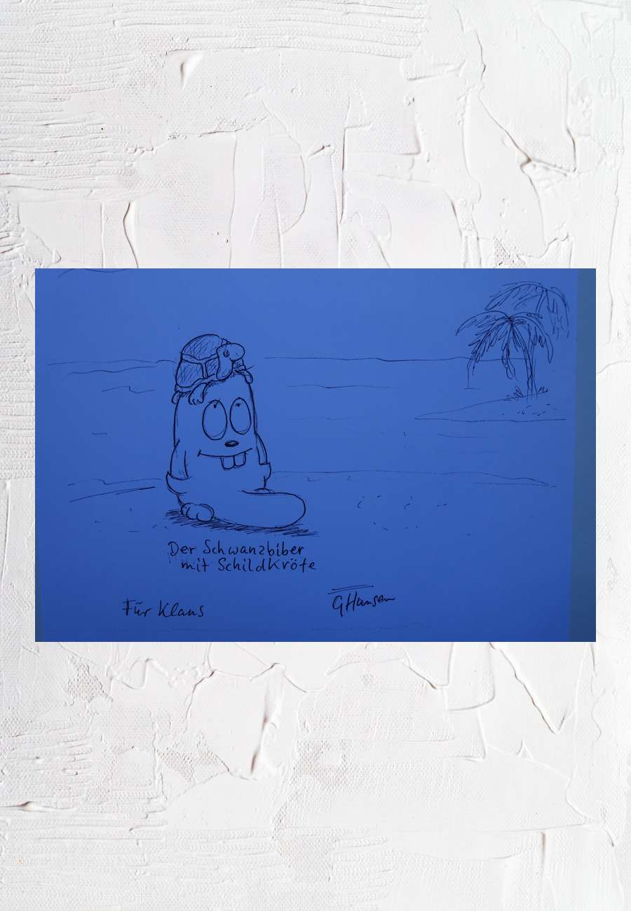 Zeichnung von Alfred Frey Villing, Illustrator und Cartoonist mit Publikationen in Titanic, SZ, FAZ und eigenen Büchern/Kalendern), Format 20 x 20 cm. Er liebte schon als Kind die Comic-Serien des Dänen Vilhelm Hansen (z.B. Petzi-Bär) und hat später seinen Künstlernamen nach ihm gewählt.