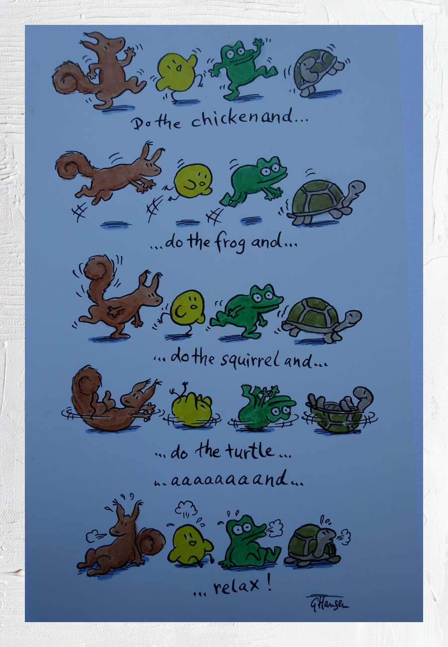 Zeichnung, Tusche, handcoloriert, sign., Format DIN A 4,. Der Künstler war u.a. beim Comicfestival München und im Valentin-Karlstadt-Musäum vertreten, er arbeitet gern in Reihen (z.B. Küken, Schwanzbiber), auch die Schildkröte kommt öfter vor.