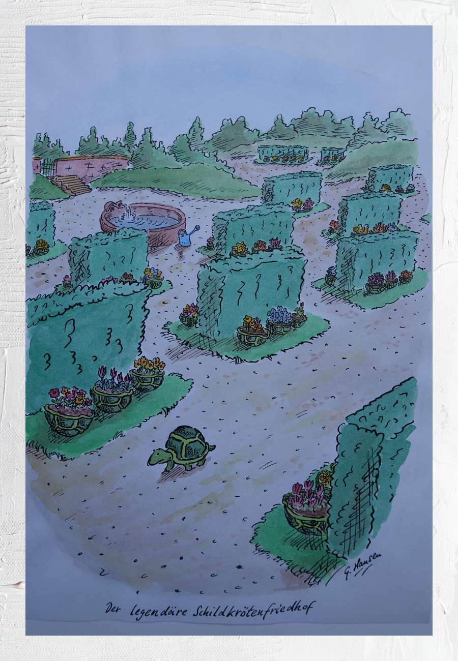 Zeichnung, Tusche, handcoloriert, sign., Format DIN A 4, Titel:"Der legendäre Schildkrötenfriedhof" (alle Blumen sind in Schildkrötenpanzer eingepflanzt).
