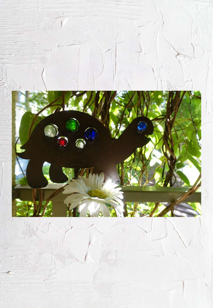 Garten- oder Balkonschmuck, Eisenblech (ausgestanzt) und Glaskugeln, mit angelötetem Stab 112 cm hoch.