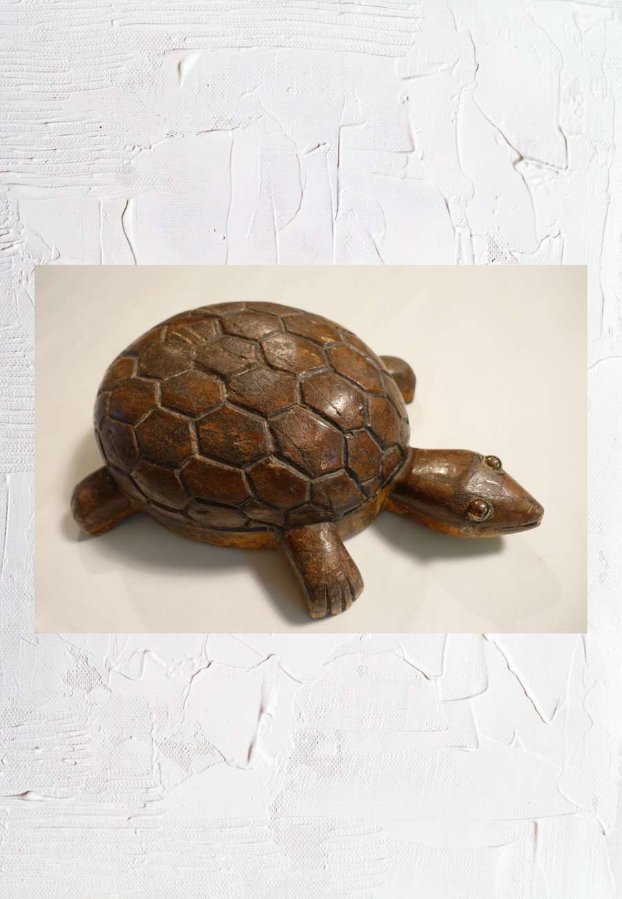 Massive Arbeit aus Teakholz, patiniert, mit tief eingekerbtem Panzermuster, die Augen sind aus Messingkugeln eingesetzt, Größe ca. 40 cm.