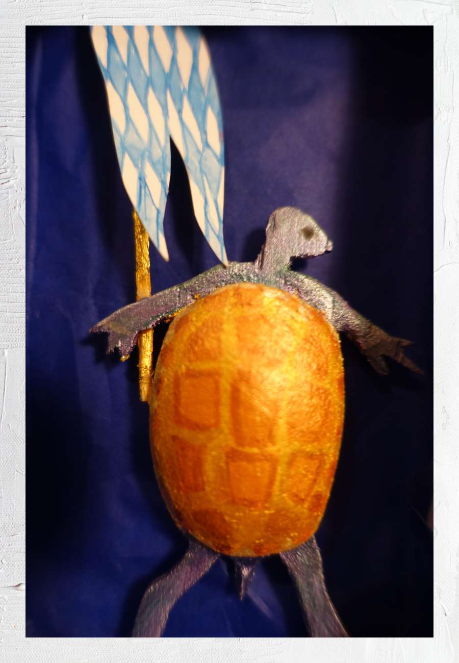 Auftragsarbeit, Unikat, plastisch gestaltet und handbemalt, aus Zirbelholz, Holzpaste und Papier (Fahne), ca. 15 cm hoch. Ausgefallenes Motiv: eine aufrecht stehende Schildkröte mit der bayer. Rautenfahne.