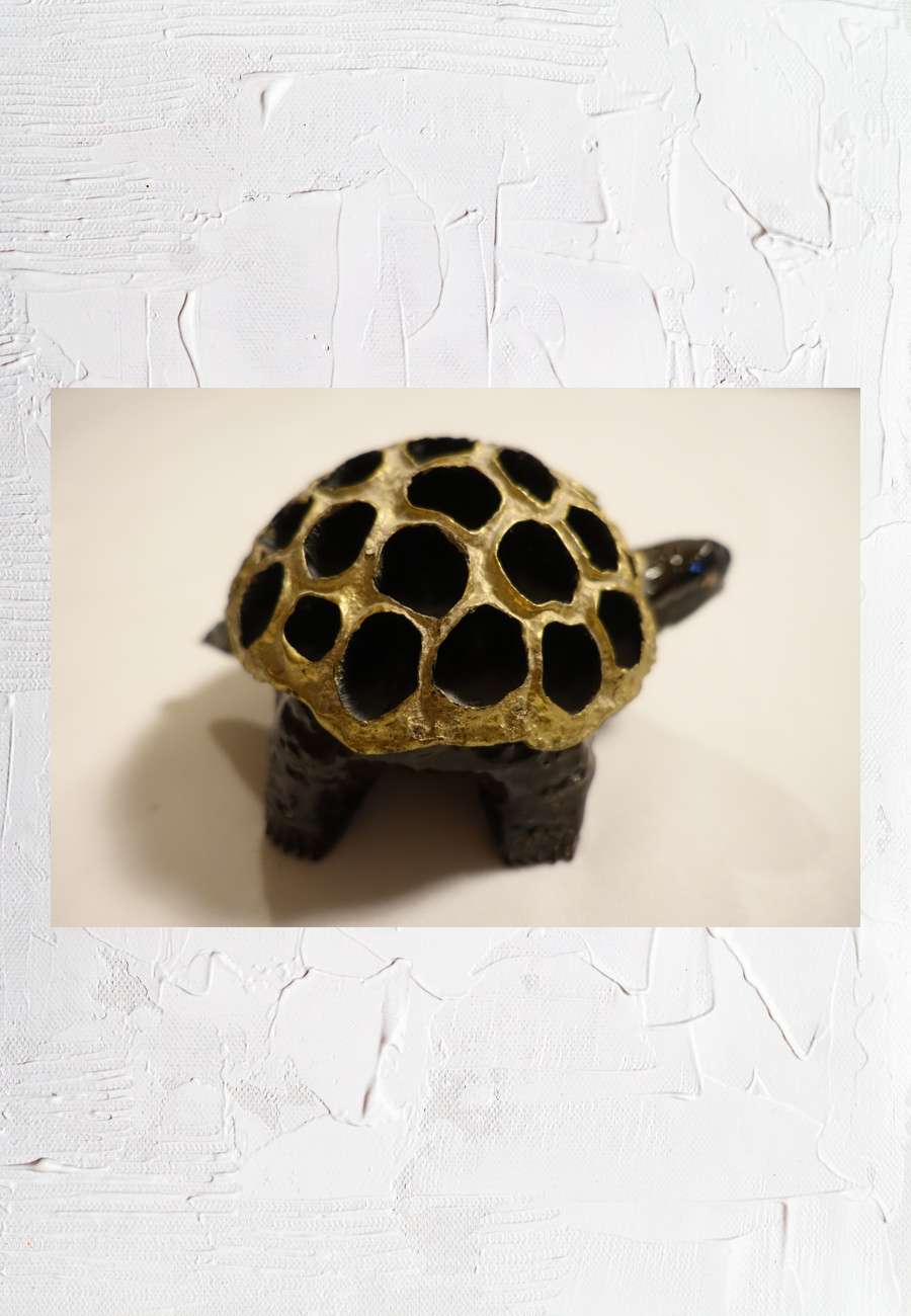 Eigene Töpferarbeit, als Panzerstruktur dient die goldbemalte Fruchtkapsel einer Lotosblüte, sign., Größe ca. 14 cm. Lotos ist in weiten Teilen Asiens Sinnbild für Reinheit, Treue, Schöpferkraft und Erleuchtung. Buddha-Statuen werden oft auf einer Lotosblüte stehend oder sitzend dargestellt (s. auch mein Buddha aus Nepal).