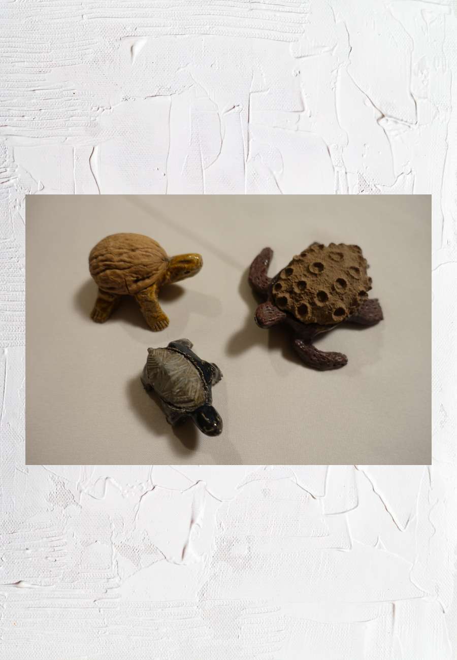 Eigene Töpferarbeiten (Unterbau), glasiert, sign., als Panzer dienen Walnußschale, Rapunzelkoralle (Versteinerung aus dem Mitteldevon, Spanisch-Sahara) und eine in
