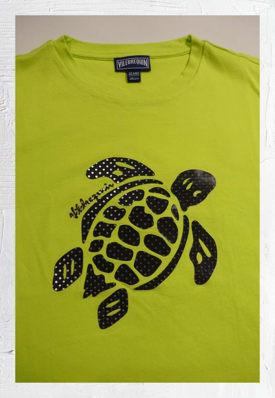T-Shirt für Kinder (mit einem 3-D-Effekt), von Vilebrequin, Paris, L´ Authenticite De Ce Produit, 100 % Baumwolle, Made in Turkey. Schildkröten sind das Markenzeichen der Firma und kommen als Motiv bei vielen Produkten vor. Man unterstützt dort wohl zu Marketingzwecken seit 2016 die Meeresschildkrötenklinik Te Moana in Moorea (Französisch Polynesien). Weitere Artikel sind unter " Suche : Vilebrequin " zu finden.