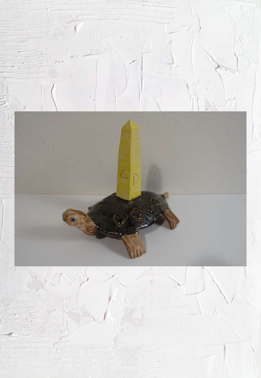 Schildkröte als Basis für einen Obelisken (vierkantiger, sich verjüngender Pfeiler mit pyramidenförmiger Spitze), selbst getöpfert und glasiert, sign., 19 cm lang und 14,5 cm hoch.
