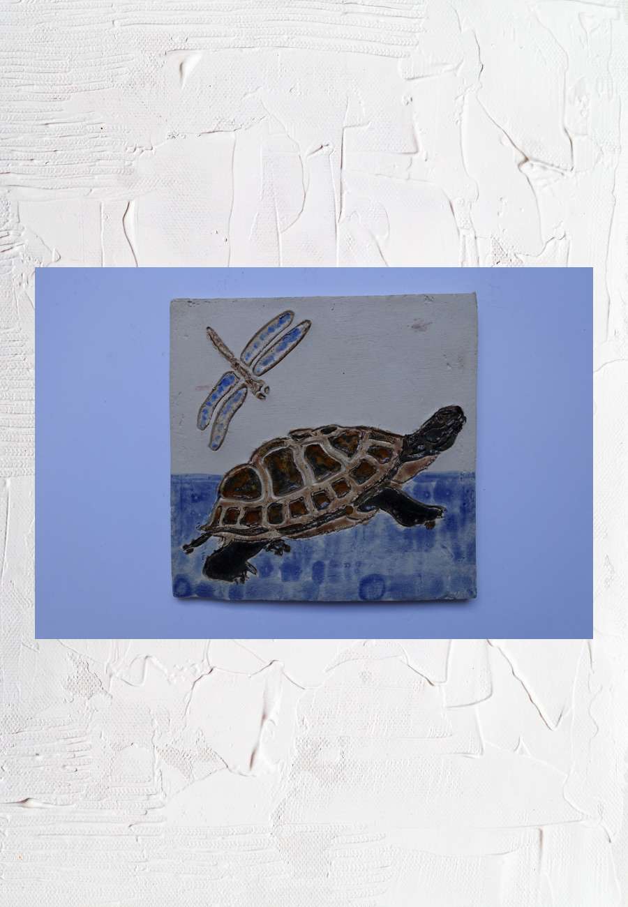 Kachel, selbstgetöpfert und glasiert, als Untersetzer nutzbar, sign.