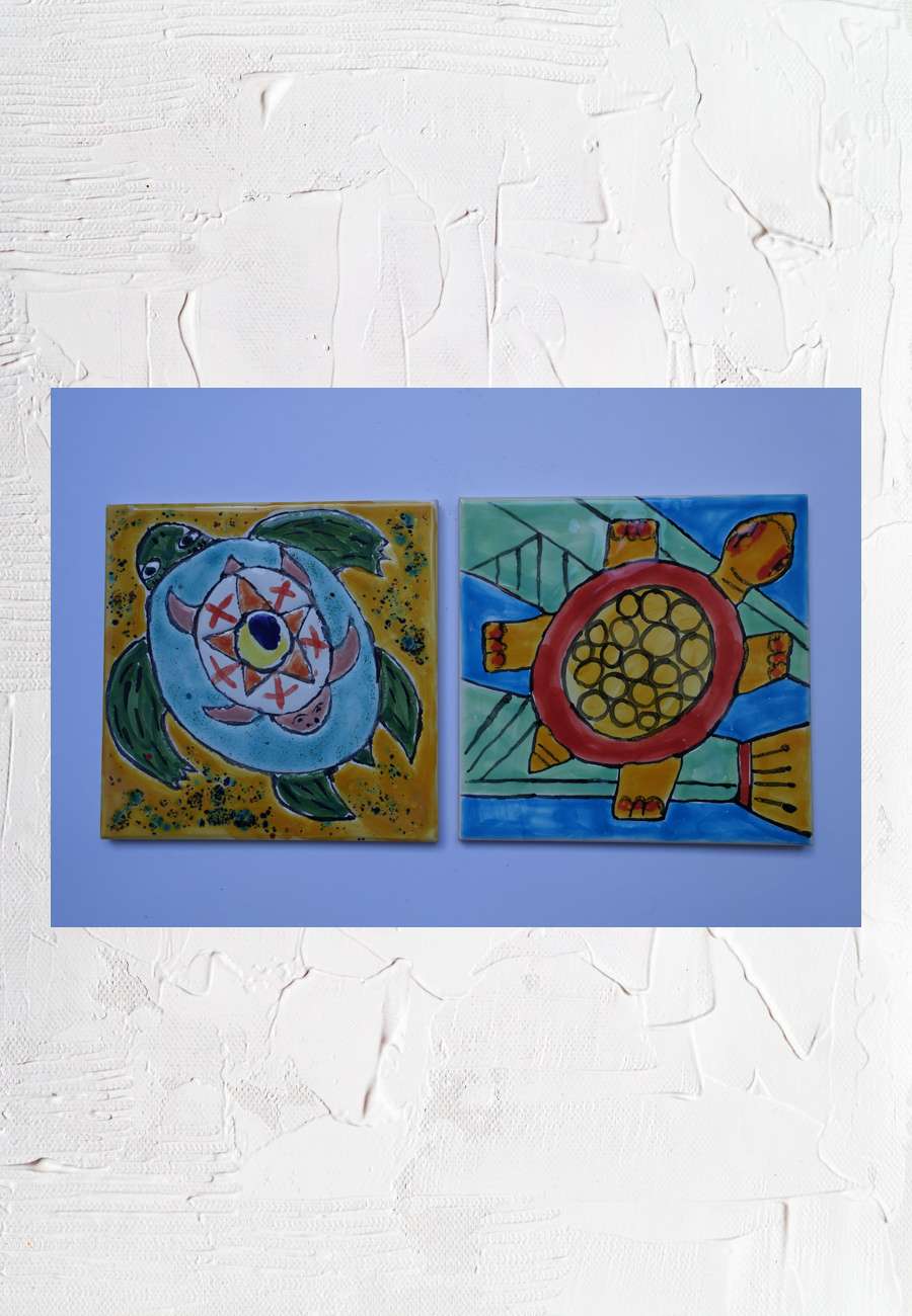 Kacheln, handbemalt, beispielsweise als Untersetzer nutzbar, sign., Format 15 x 15 cm.