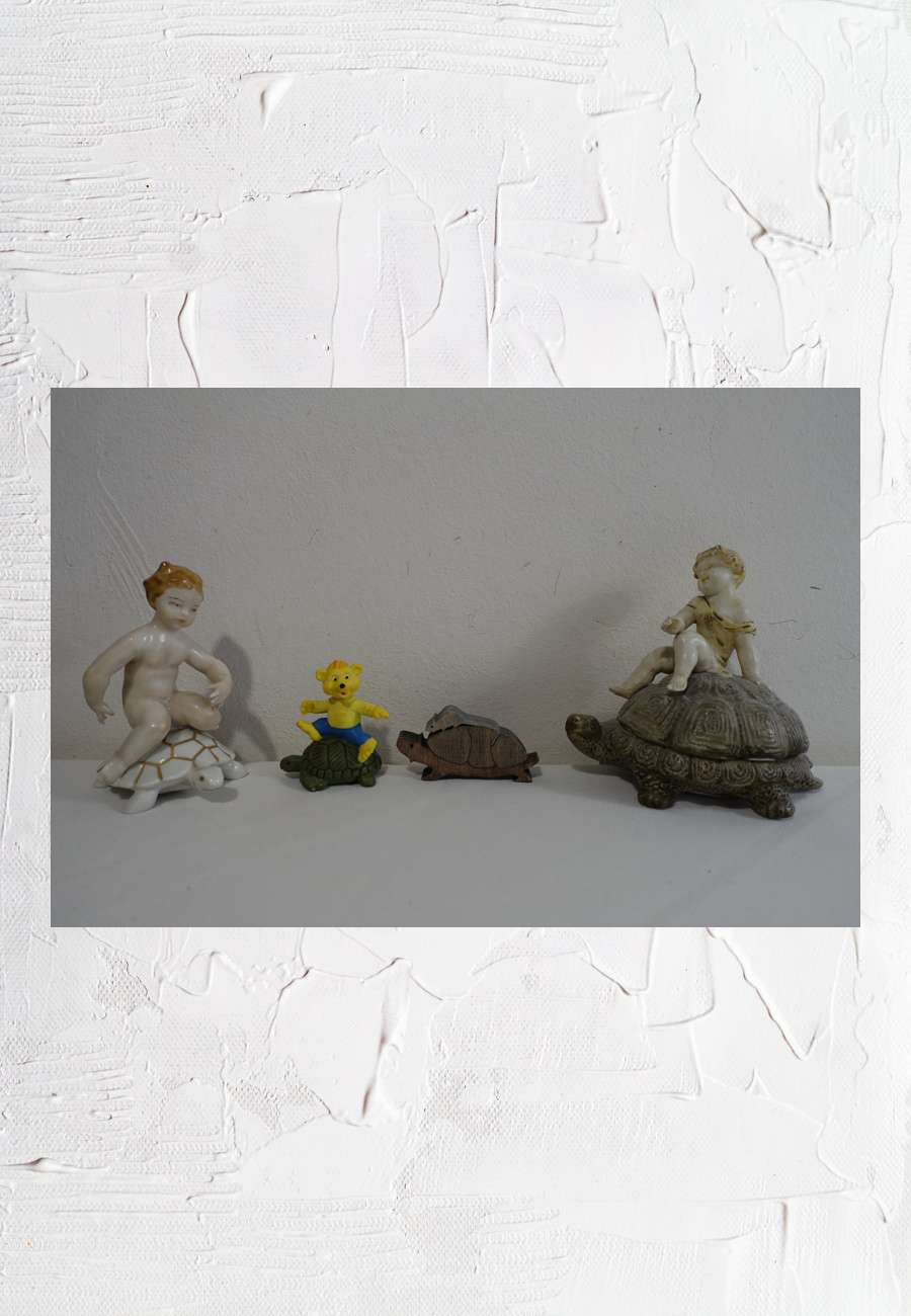 Was halt so auf Schildkröten (aus Keramik/Dresden, Plastik/Ravensburger und Holz/Bayern) sitzt - vom Putto bis zur Maus.