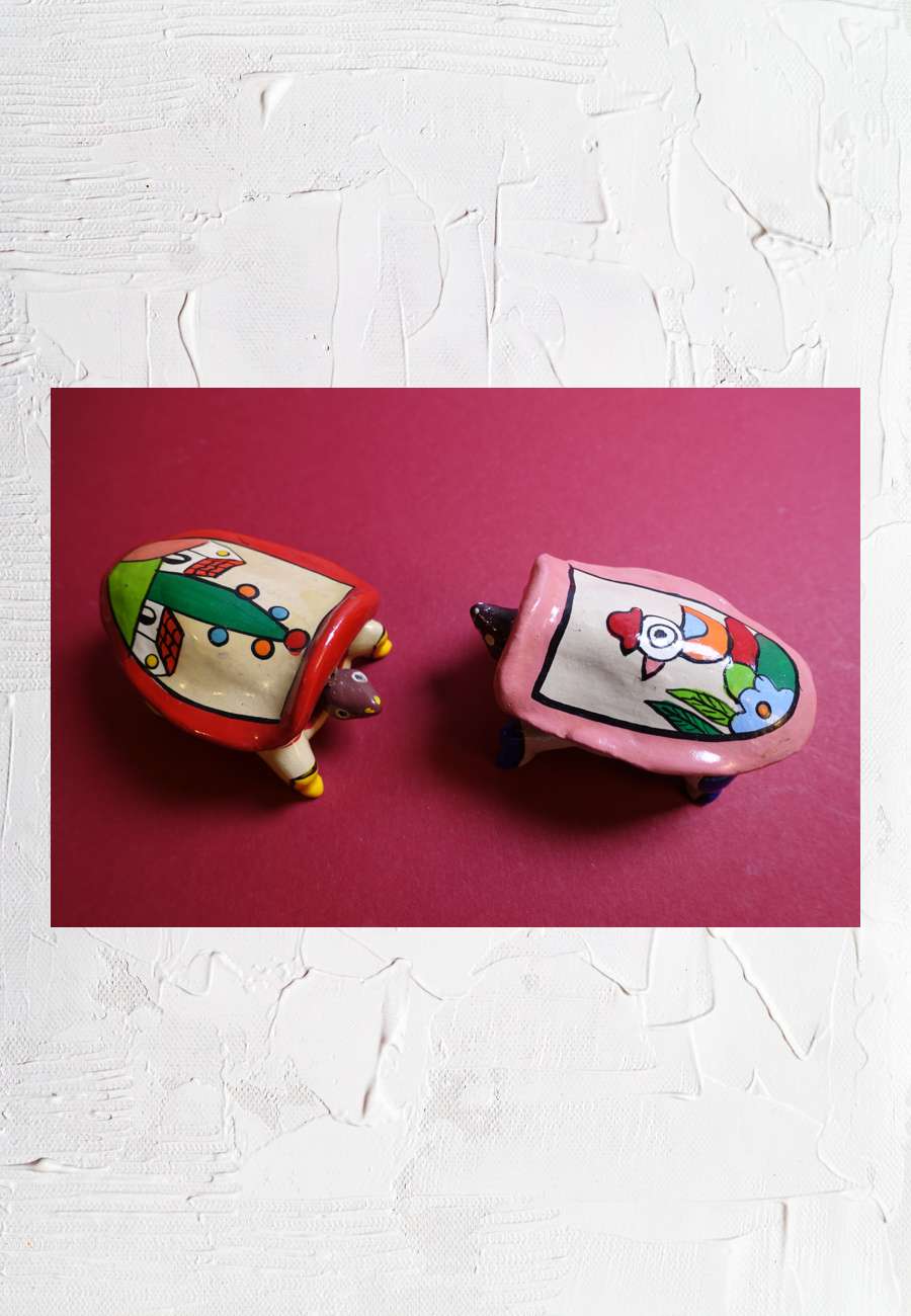 Handgetöpfert und bemalt, Kopf beweglich eingehängt, je ca. 6 cm.