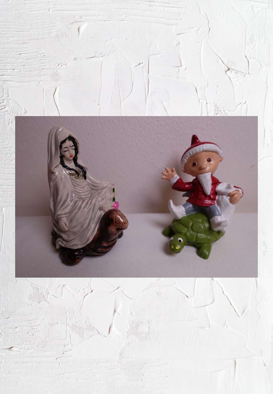 Hier sitzen zur Abwechslung eine marienähnliche Figur (Keramik) und das Sandmännchen (Kunststoff/DDR) auf der Schildkröte.