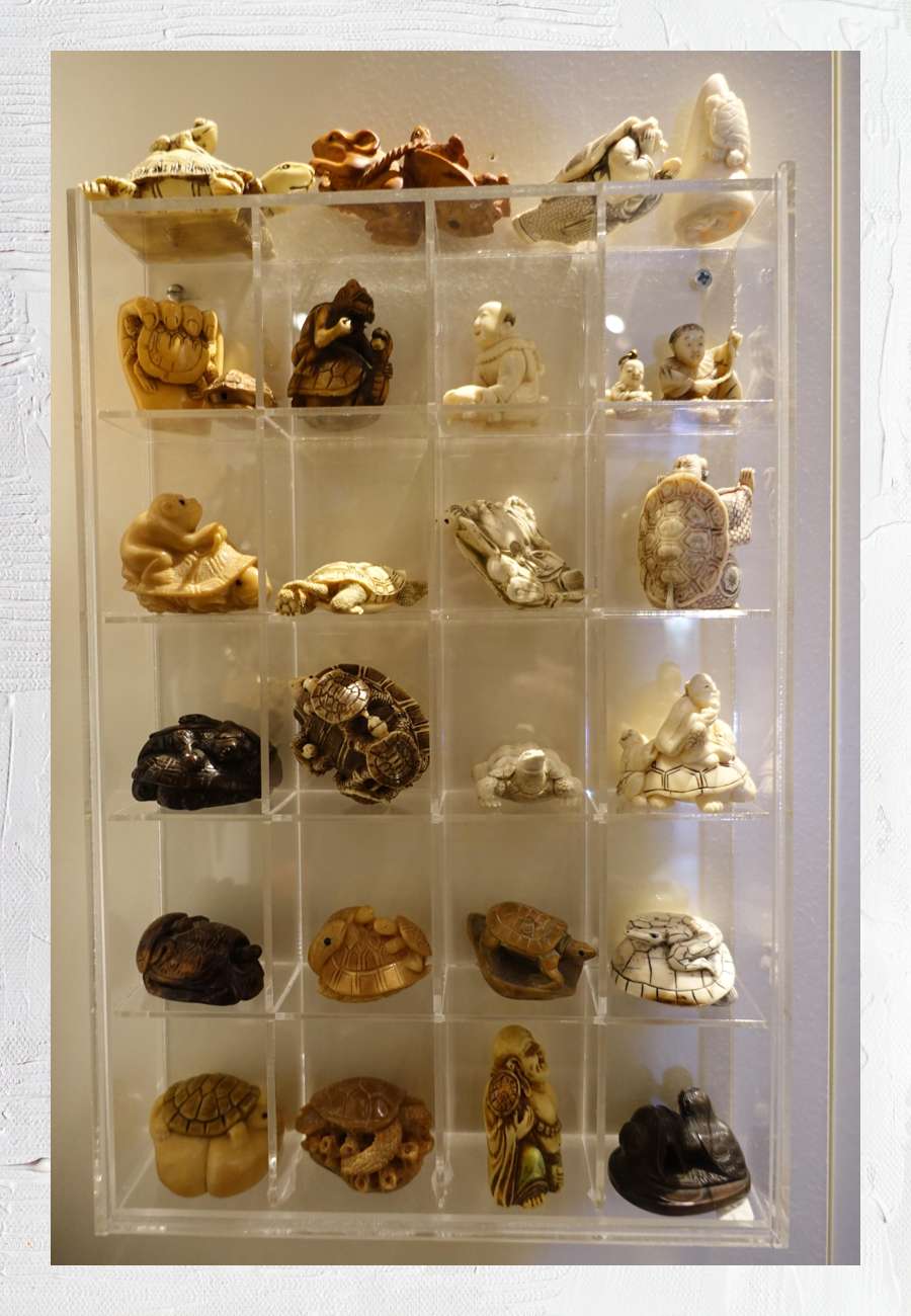 Stichworte sind Netsuke und Japan. Hier ein Teil meiner Sammlung dieser kleinen und kunstvollen Werke, handgeschnitzt, überwiegend aus Elfenbein, aber auch Buchsbaum, meist um 1900, Größe zwischen 1,5 und 6,5 cm. Eine generelle Beschreibung zu diesen Objekten findet sich unter "Ausstellung /Suche > Netsuke Pferd".