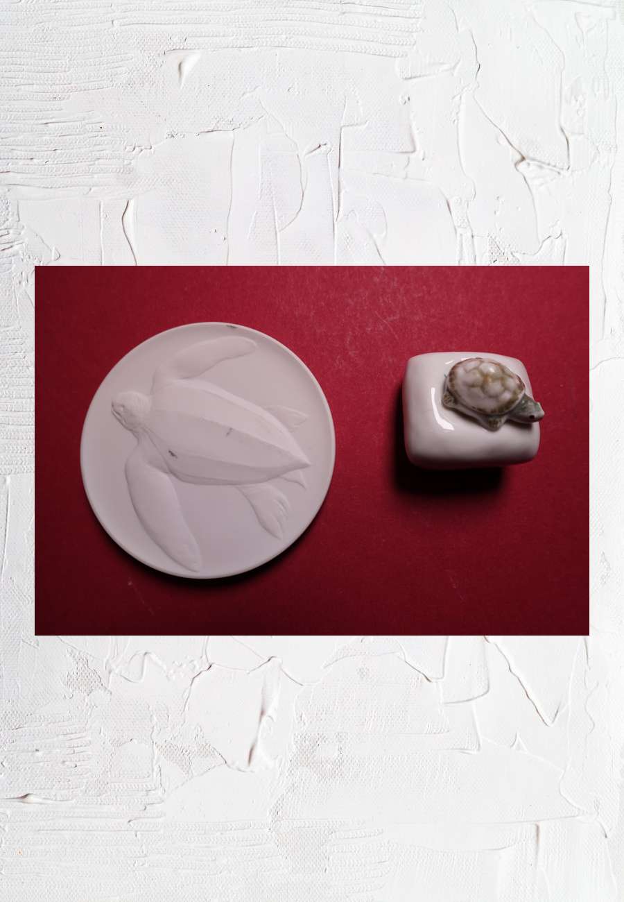 Links: Medaillon mit Lederschildkröte (die das sehr beachtliche Meeresmuseum symbolisiert), anläßlich 750 Jahre Stralsund 1234 - 1984, Durchmesser 6,5 cm. Rechts: Schildkrötchen, bemalt, auf quadratischem Sockel; beide Teile stammen aus