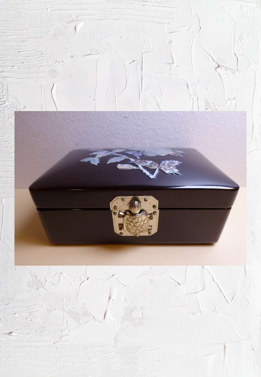 Schmuckkästchen, Lack (aus dem Harz des Lackbaums) mit Permutteinlagen , Metallverschluß, innen mit Spiegel und rotem Samt, Größe 14,5 x 10 x 6,5 cm.