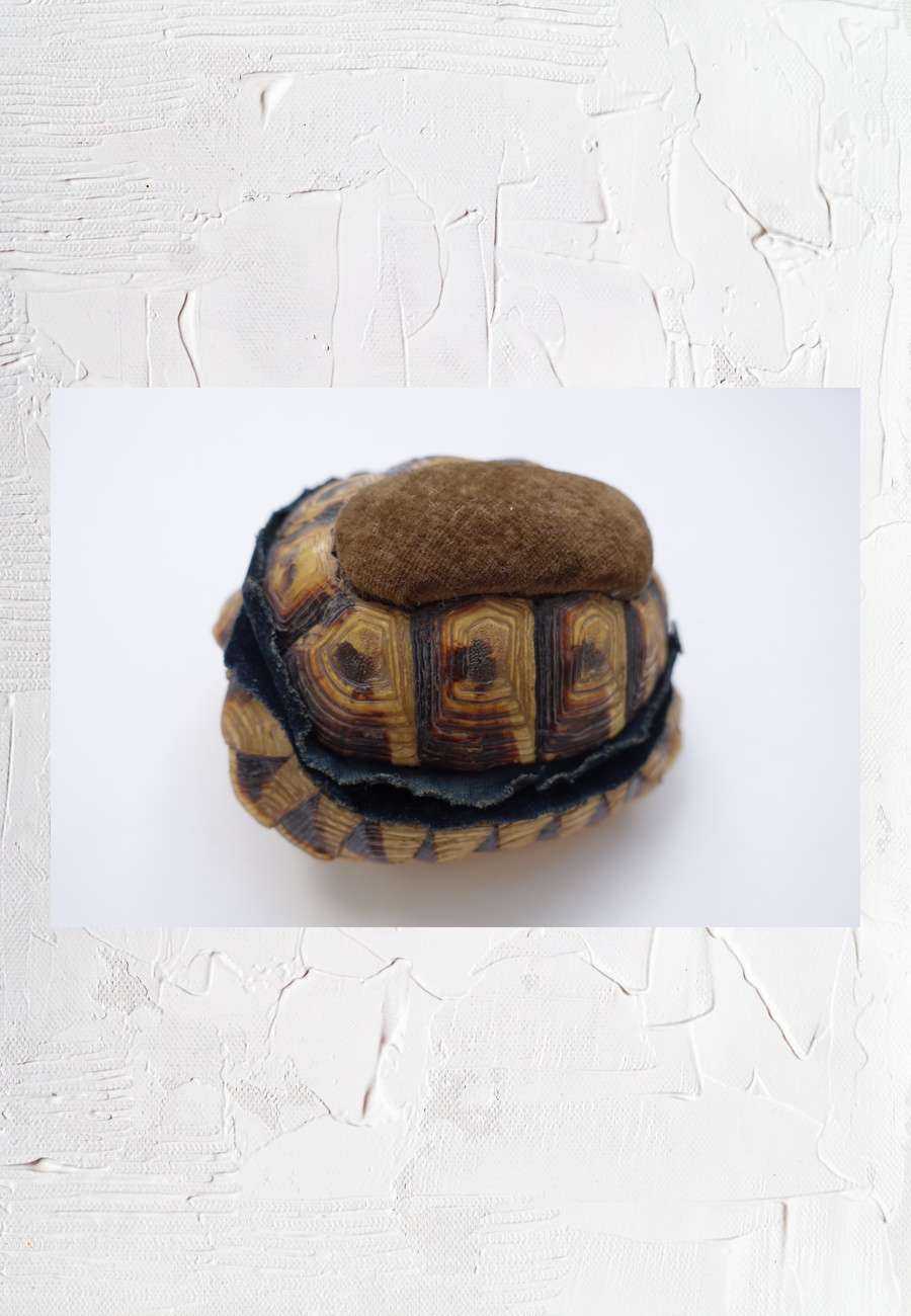Das Schmuckkästchen (s. weiteres Foto der Innenseite) diente einer Bäuerin aus dem Chiemgau zugleich als Nadelkissen. Den Panzer einer Griechischen Landschildkröte hatte ihr Mann aus dem 1. Weltkrieg mitgebracht und für sie zu einem besonderen Geschenk verarbeitet, Größe ca. 9 cm. Dies hat Dr. h.c. Honegger, der nach entsprechenden Objekten aus dieser Zeit suchte, u.a. veranlasst, einen größeren Artikel zu veröffentlichen, mit dem originellen Titel "Wie die schöne Griechin in die Küche kam".