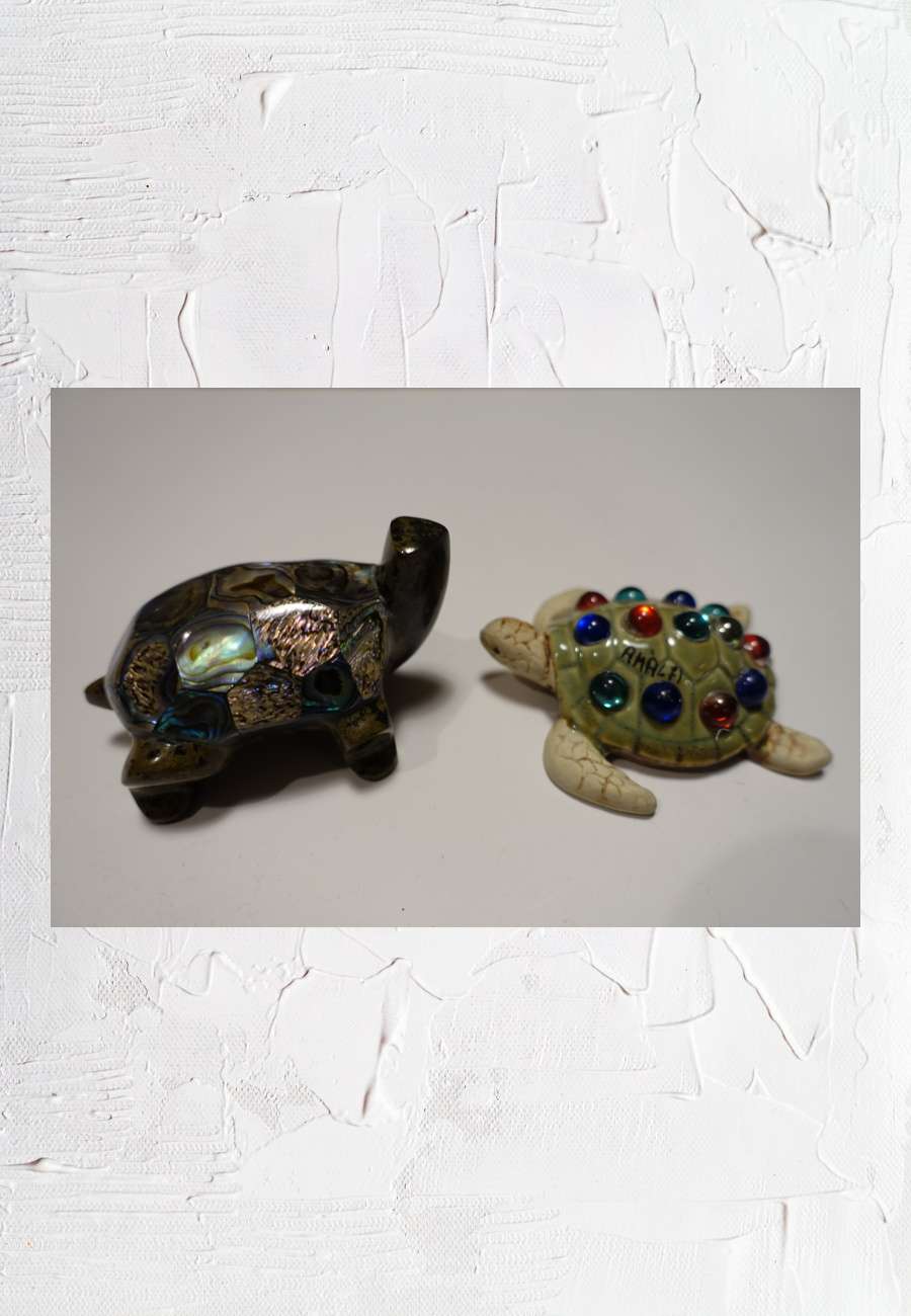Objekt aus schwarzbraunem Naturstein mit mosaikartigen Perlmutteinlagen (Asien) und Keramik mit bunten Glasperlen aus Amalfi (Italien).
