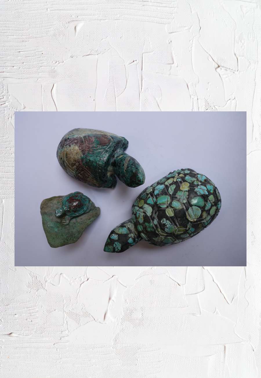 Aus türkishaltigen Natursteinen herausgearbeitet, Größe 11 cm, sowie 6 und 12 cm, Herkunft aus verschiedenen Ländern Asiens.